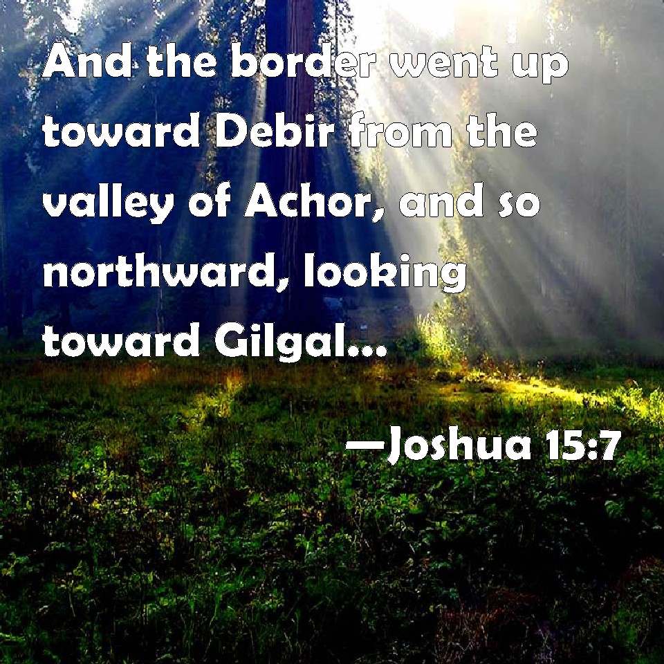 Choose a Background Joshua 15:7 And the border went up toward Debir from the valley of Achor, and so northward, looking toward Gilgal, that is before the going up to Adummim, which is on the south side of the river: and the border passed toward the waters of Enshemesh, and the goings out thereof were at Enrogel: KJV: And the border went up toward Debir from the valley of Achor, and so northward, looking toward Gilgal, that is before the going up to Adummim, which is on the south side of the river: and the border passed toward the waters of Enshemesh, and the goings out thereof were at Enrogel: DRB: And reaching as far as the borders of Debara from the valley of Achor, and so northward looking towards Galgal, which is opposite to the ascent of Adommin, on the south side of the torrent: and the border passeth the waters that are called the fountain of the sun: and the goings out thereof shall be at the fountain Rogel. DBT: and the border went up toward Debir from the valley of Achor, and turned northward to Gilgal, which is opposite to the ascent of Adummim, which is on the south side of the torrent; and the border passed to the waters of En-shemesh, and ended at En-rogel; ERV: and the border went up to Debir from the valley of Achor, and so northward, looking toward Gilgal, that is over against the ascent of Adummim, which is on the south side of the river: and the border passed along to the waters of En-shemesh, and the goings out thereof were at En-rogel: WBT: And the border went up towards Debir from the valley of Achor, and so northward looking towards Gilgal, that is before the going up to Adummim, which is on the south side of the river: and the border passed towards the waters of En-shemesh, and the borders of it were at En-rogel: WEB: The border went up to Debir from the valley of Achor, and so northward, looking toward Gilgal, that is over against the ascent of Adummim, which is on the south side of the river. The border passed along to the waters of En Shemesh, and ended at En Rogel. YLT: and the border hath gone up towards Debir from the valley of Achor, and northward looking unto Gilgal, which is over-against the ascent of Adummim, which is on the south of the brook, and the border hath passed over unto the waters of En-Shemesh, and its outgoings have been unto En-Rogel;Links Joshua 15:7 NIV • Joshua 15:7 NLT • Joshua 15:7 ESV • Joshua 15:7 NASB • Joshua 15:7 KJV • Joshua 15:7 Interlinear • Joshua 15:7 Commentaries • Joshua 15:7 Parallel Texts • Joshua 15:7 Bible Apps • Joshua 15:7 Parallel • Bible Hub |