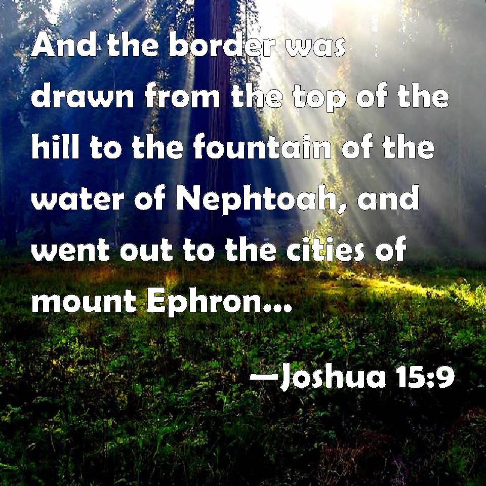 Choose a Background Joshua 15:9 And the border was drawn from the top of the hill to the fountain of the water of Nephtoah, and went out to the cities of mount Ephron; and the border was drawn to Baalah, which is Kirjathjearim: KJV: And the border was drawn from the top of the hill unto the fountain of the water of Nephtoah, and went out to the cities of mount Ephron; and the border was drawn to Baalah, which is Kirjathjearim: DRB: And it passeth on from the top of the mountain to the fountain of the water of Nephtoa: and reacheth to the towns of mount Ephron: and it bendeth towards Baala, which is Cariathiarim, that is to say, the city of the woods. DBT: and the border reached along from the top of the mountain toward the spring of the waters of Nephtoah, and went out toward the cities of mount Ephron; and the border reached along to Baalah, that is, Kirjath-jearim; ERV: and the border was drawn from the top of the mountain unto the fountain of the waters of Nephtoah, and went out to the cities of mount Ephron; and the border was drawn to Baalah (the same is Kiriath-jearim): WBT: And the border was drawn from the top of the hill to the fountain of the water of Nephtoah, and went out to the cities of mount Ephron; and the border was drawn to Baalah, which is Kirjath-jearim: WEB: The border extended from the top of the mountain to the spring of the waters of Nephtoah, and went out to the cities of Mount Ephron; and the border extended to Baalah (the same is Kiriath Jearim); YLT: and the border hath been marked out, from the top of the hill-country unto the fountain of the waters of Nephtoah, and hath gone out unto the cities of mount Ephron, and the border hath been marked out to Baalah, (it is Kirjath-Jearim);Links Joshua 15:9 NIV • Joshua 15:9 NLT • Joshua 15:9 ESV • Joshua 15:9 NASB • Joshua 15:9 KJV • Joshua 15:9 Interlinear • Joshua 15:9 Commentaries • Joshua 15:9 Parallel Texts • Joshua 15:9 Bible Apps • Joshua 15:9 Parallel • Bible Hub |