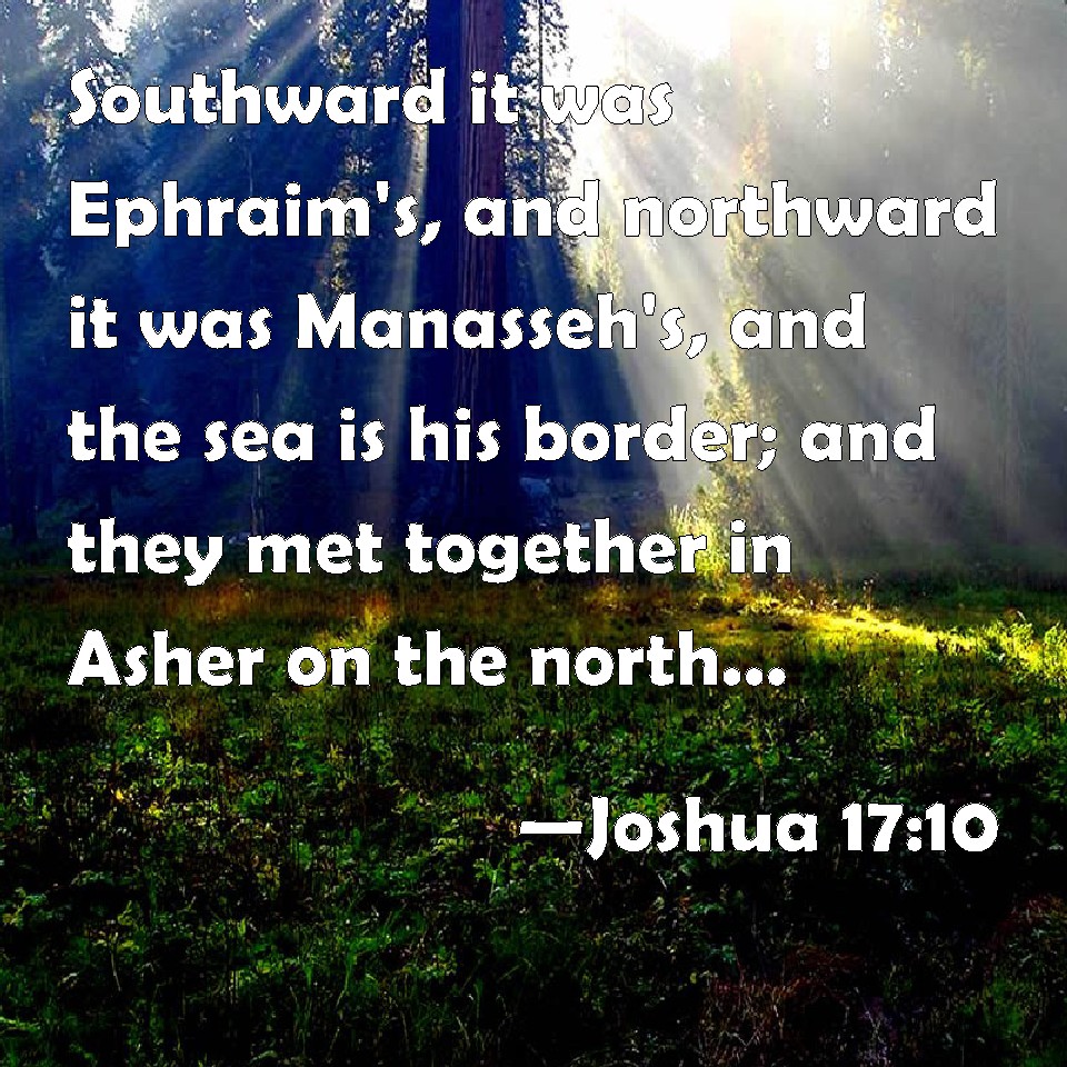 Choose a Background Joshua 17:10 Southward it was Ephraim's, and northward it was Manasseh's, and the sea is his border; and they met together in Asher on the north, and in Issachar on the east. KJV: Southward it was Ephraim's, and northward it was Manasseh's, and the sea is his border; and they met together in Asher on the north, and in Issachar on the east. DRB: So that the possession of Ephraim is on the south, and on the north that of Manasses, and the sea is the border of both, and they are joined together in the tribe of Aser on the north, and in the tribe of Issachar on the east. DBT: Southward it was Ephraim's, and northward it was Manasseh's, and the sea was his border. And they touched upon Asher on the north, and upon Issachar on the east. ERV: southward it was Ephraim's, and northward it was Manasseh's, and the sea was his border; and they reached to Asher on the north, and to Issachar on the east. WBT: Southward it was Ephraim's, and northward it was Manasseh's, and the sea is his border; and they met together in Asher on the north, and in Issachar on the east. WEB: Southward it was Ephraim's, and northward it was Manasseh's, and the sea was his border. They reached to Asher on the north, and to Issachar on the east. YLT: Southward is to Ephraim and northward to Manasseh, and the sea is his border, and in Asher they meet on the north, and in Issachar on the east.Links Joshua 17:10 NIV • Joshua 17:10 NLT • Joshua 17:10 ESV • Joshua 17:10 NASB • Joshua 17:10 KJV • Joshua 17:10 Interlinear • Joshua 17:10 Commentaries • Joshua 17:10 Parallel Texts • Joshua 17:10 Bible Apps • Joshua 17:10 Parallel • Bible Hub |