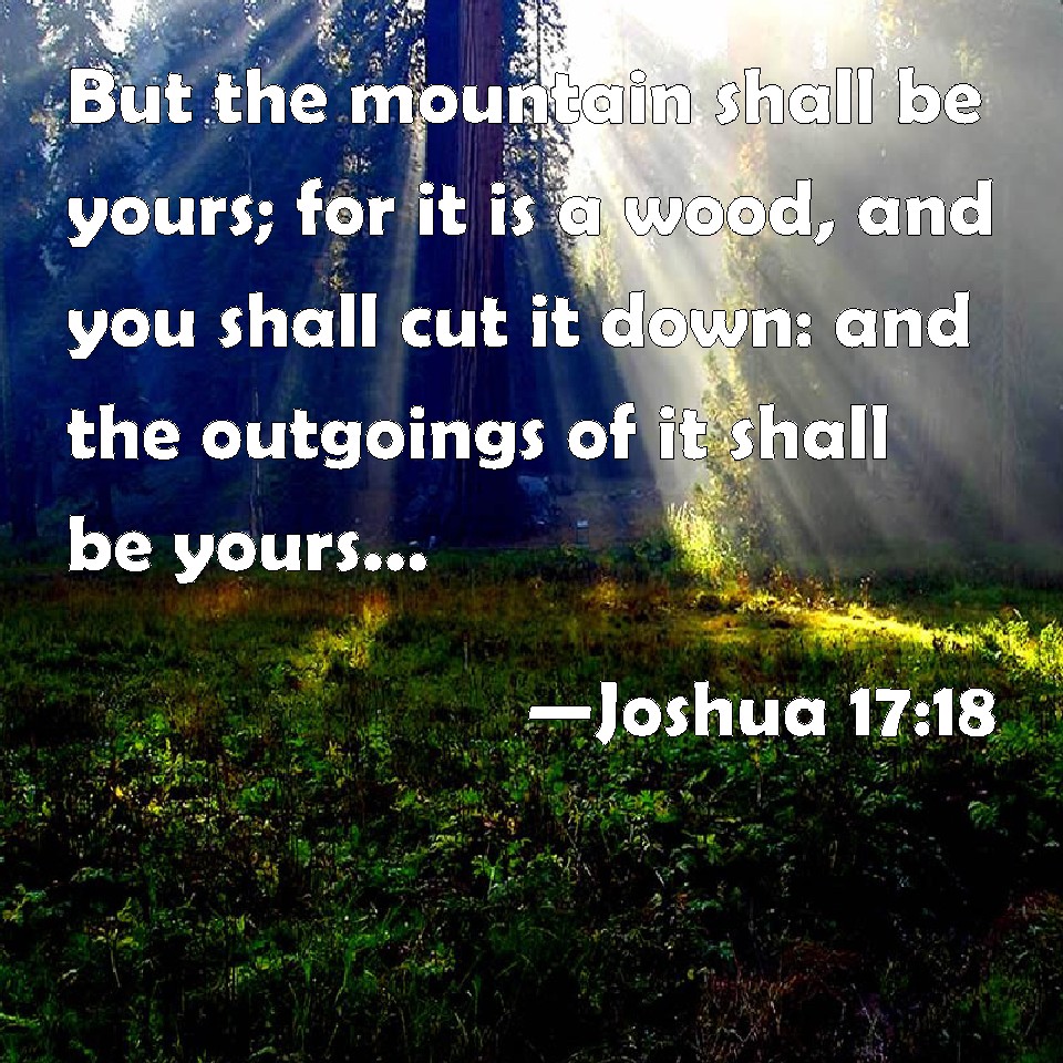 Choose a Background Joshua 17:18 But the mountain shall be yours; for it is a wood, and you shall cut it down: and the outgoings of it shall be yours: for you shall drive out the Canaanites, though they have iron chariots, and though they be strong. KJV: But the mountain shall be thine; for it is a wood, and thou shalt cut it down: and the outgoings of it shall be thine: for thou shalt drive out the Canaanites, though they have iron chariots, and though they be strong. DRB: But thou shalt pass to the mountain, and shalt cut down the wood, and make thyself room to dwell in: and mayst proceed farther, when thou hast destroyed the Chanaanites, who as thou sayest have iron chariots, and are very strong. DBT: but the hill-country shall be thine, as it is a wood, thou shalt cut it down, and its outgoings shall be thine; for thou shalt dispossess the Canaanites, though they have iron chariots; for they are powerful. ERV: but the hill country shall be thine; for though it is a forest, thou shalt cut it down, and the goings out thereof shall be thine: for thou shalt drive out the Canaanites, though they have chariots of iron, and though they be strong. WBT: But the mountain shall be thine; for it is a wood, and thou shalt cut it down: and the limits of it shall be thine: for thou shalt drive out the Canaanites, though they have iron chariots, and though they are strong. WEB: but the hill country shall be yours. Although it is a forest, you shall cut it down, and it's farthest extent shall be yours; for you shall drive out the Canaanites, though they have chariots of iron, and though they are strong." YLT: because the mountain is thine; because it is a forest — thou hast prepared it, and its outgoings have been thine; because thou dost dispossess the Canaanite, though it hath chariots of iron — though it is strong.'Links Joshua 17:18 NIV • Joshua 17:18 NLT • Joshua 17:18 ESV • Joshua 17:18 NASB • Joshua 17:18 KJV • Joshua 17:18 Interlinear • Joshua 17:18 Commentaries • Joshua 17:18 Parallel Texts • Joshua 17:18 Bible Apps • Joshua 17:18 Parallel • Bible Hub |