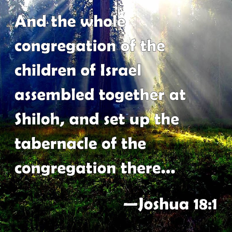 Choose a Background Joshua 18:1 And the whole congregation of the children of Israel assembled together at Shiloh, and set up the tabernacle of the congregation there. And the land was subdued before them. KJV: And the whole congregation of the children of Israel assembled together at Shiloh, and set up the tabernacle of the congregation there. And the land was subdued before them. DRB: And all the children of Israel assembled together in Silo, and there they set up the tabernacle of the testimony, and the land was subdued before them. DBT: And the whole assembly of the children of Israel gathered together at Shiloh, and set up the tent of meeting there; and the land was subdued before them. ERV: And the whole congregation of the children of Israel assembled themselves together at Shiloh, and set up the tent of meeting there: and the land was subdued before them. WBT: And the whole congregation of the children of Israel assembled at Shiloh, and set up the tabernacle of the congregation there: and the land was subdued before them. WEB: The whole congregation of the children of Israel assembled themselves together at Shiloh, and set up the Tent of Meeting there. The land was subdued before them. YLT: And all the company of the sons of Israel are assembled at Shiloh, and they cause the tent of meeting to tabernacle there, and the land hath been subdued before them.Links Joshua 18:1 NIV • Joshua 18:1 NLT • Joshua 18:1 ESV • Joshua 18:1 NASB • Joshua 18:1 KJV • Joshua 18:1 Interlinear • Joshua 18:1 Commentaries • Joshua 18:1 Parallel Texts • Joshua 18:1 Bible Apps • Joshua 18:1 Parallel • Bible Hub |