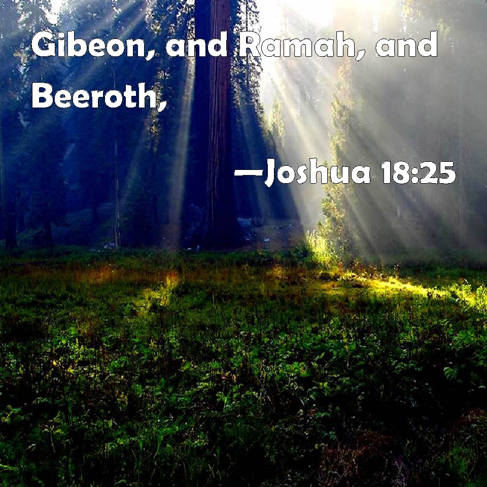 Choose a Background Joshua 18:25 Gibeon, and Ramah, and Beeroth, KJV: Gibeon, and Ramah, and Beeroth, DRB: Gabam and Rama and Beroth, DBT: Gibeon, and Ramah, and Beeroth, ERV: Gibeon, and Ramah, and Beeroth; WBT: Gibeon, and Ramah, and Beeroth, WEB: Gibeon, Ramah, Beeroth, YLT: Gibeon, and Ramah, and Beeroth,Links Joshua 18:25 NIV • Joshua 18:25 NLT • Joshua 18:25 ESV • Joshua 18:25 NASB • Joshua 18:25 KJV • Joshua 18:25 Interlinear • Joshua 18:25 Commentaries • Joshua 18:25 Parallel Texts • Joshua 18:25 Bible Apps • Joshua 18:25 Parallel • Bible Hub |