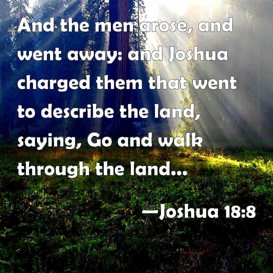Choose a Background Joshua 18:8 And the men arose, and went away: and Joshua charged them that went to describe the land, saying, Go and walk through the land, and describe it, and come again to me, that I may here cast lots for you before the LORD in Shiloh. KJV: And the men arose, and went away: and Joshua charged them that went to describe the land, saying, Go and walk through the land, and describe it, and come again to me, that I may here cast lots for you before the LORD in Shiloh. DRB: And when the men were risen up, to go to mark out the land, Josue commanded them, saying: Go round the land and mark it out, and return to me: that I may cast lots for you before the Lord in Silo. DBT: And the men arose and went away. And Joshua charged them that went to describe the land, saying, Go and walk through the land, and describe it, and come again to me, and I will cast lots for you here before Jehovah in Shiloh. ERV: And the men arose, and went: and Joshua charged them that went to describe the land, saying, Go and walk through the land, and describe it, and come again to me, and I will cast lots for you here before the LORD in Shiloh. WBT: And the men arose, and departed: and Joshua charged them that went to describe the land, saying, Go, and walk through the land, and describe it, and come again to me, that I may here cast lots for you before the LORD in Shiloh. WEB: The men arose and went. Joshua commanded those who went to survey the land, saying, "Go walk through the land, survey it, and come again to me. I will cast lots for you here before Yahweh in Shiloh." YLT: And the men rise and go; and Joshua commandeth those who are going to describe the land, saying, 'Go, and walk up and down through the land, and describe it, and turn back unto me, and here I cast for you a lot before Jehovah in Shiloh.'Links Joshua 18:8 NIV • Joshua 18:8 NLT • Joshua 18:8 ESV • Joshua 18:8 NASB • Joshua 18:8 KJV • Joshua 18:8 Interlinear • Joshua 18:8 Commentaries • Joshua 18:8 Parallel Texts • Joshua 18:8 Bible Apps • Joshua 18:8 Parallel • Bible Hub |