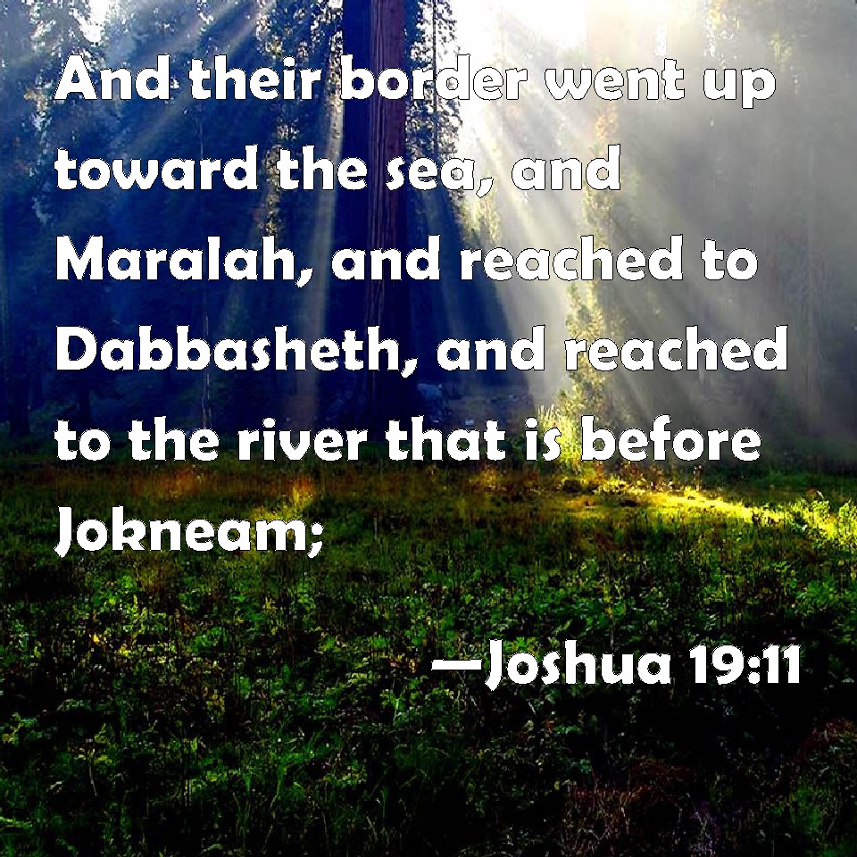 Choose a Background Joshua 19:11 And their border went up toward the sea, and Maralah, and reached to Dabbasheth, and reached to the river that is before Jokneam; KJV: And their border went up toward the sea, and Maralah, and reached to Dabbasheth, and reached to the river that is before Jokneam; DRB: And it went up from the sea and from Merala, and came to Debbaseth: as far as the torrent, which is over against Jeconam. DBT: and their border went up westwards, and to Marealah, and reached to Dabbesheth, and reached to the torrent that is before Jokneam; ERV: and their border went up westward, even to Maralah, and reached to Dabbesheth; and it reached to the brook that is before Jokneam; WBT: And their border went up towards the sea, and Maralah, and reached to Dabbasheth, and reached to the river that is before Jokneam, WEB: Their border went up westward, even to Maralah, and reached to Dabbesheth. It reached to the brook that is before Jokneam. YLT: and their border hath gone up towards the sea, and Maralah, and come against Dabbasheth, and come unto the brook which is on the front of Jokneam,Links Joshua 19:11 NIV • Joshua 19:11 NLT • Joshua 19:11 ESV • Joshua 19:11 NASB • Joshua 19:11 KJV • Joshua 19:11 Interlinear • Joshua 19:11 Commentaries • Joshua 19:11 Parallel Texts • Joshua 19:11 Bible Apps • Joshua 19:11 Parallel • Bible Hub |