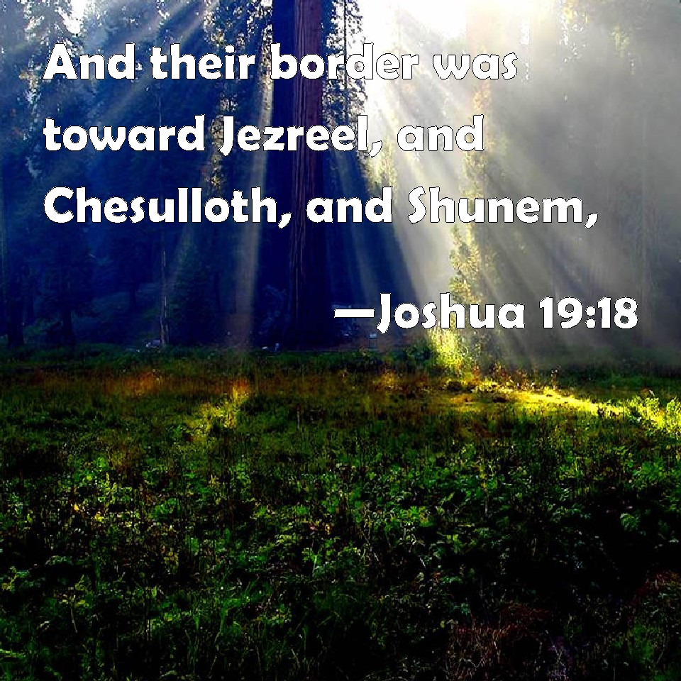 Choose a Background Joshua 19:18 And their border was toward Jezreel, and Chesulloth, and Shunem, KJV: And their border was toward Jezreel, and Chesulloth, and Shunem, DRB: And his inheritance was Jezrael and Casaloth and Sunem, DBT: And their territory was toward Jizreel, and Chesulloth, and Shunem, ERV: And their border was unto Jezreel, and Chesulloth, and Shunem; WBT: And their border was towards Jezreel, and Chesulloth, and Shunem, WEB: Their border was to Jezreel, Chesulloth, Shunem, YLT: and their border is at Jezreel, and Chesulloth, and Shunem,Links Joshua 19:18 NIV • Joshua 19:18 NLT • Joshua 19:18 ESV • Joshua 19:18 NASB • Joshua 19:18 KJV • Joshua 19:18 Interlinear • Joshua 19:18 Commentaries • Joshua 19:18 Parallel Texts • Joshua 19:18 Bible Apps • Joshua 19:18 Parallel • Bible Hub |