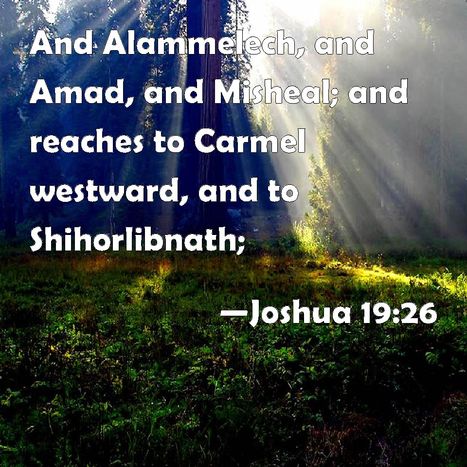 Choose a Background Joshua 19:26 And Alammelech, and Amad, and Misheal; and reaches to Carmel westward, and to Shihorlibnath; KJV: And Alammelech, and Amad, and Misheal; and reacheth to Carmel westward, and to Shihorlibnath; DRB: And Elmelech and Amaad and Messal: and it reacheth to Carmel by the sea and Sihor and Labanath, DBT: and Allammelech, and Amead, and Mishal; and the border reached to Carmel westwards, and to Shihor-libnath, ERV: and Allammelech, and Amad, and Mishal; and it reached to Carmel westward, and to Shihor-libnath; WBT: And Alammelech, and Amad, and Misheal; and reacheth to Carmel westward, and to Shihor-libnath; WEB: Allammelech, Amad, Mishal. It reached to Carmel westward, and to Shihorlibnath. YLT: and Alammelech, and Amad, and Misheal; and it toucheth against Carmel westward, and against Shihor-Libnath;Links Joshua 19:26 NIV • Joshua 19:26 NLT • Joshua 19:26 ESV • Joshua 19:26 NASB • Joshua 19:26 KJV • Joshua 19:26 Interlinear • Joshua 19:26 Commentaries • Joshua 19:26 Parallel Texts • Joshua 19:26 Bible Apps • Joshua 19:26 Parallel • Bible Hub |