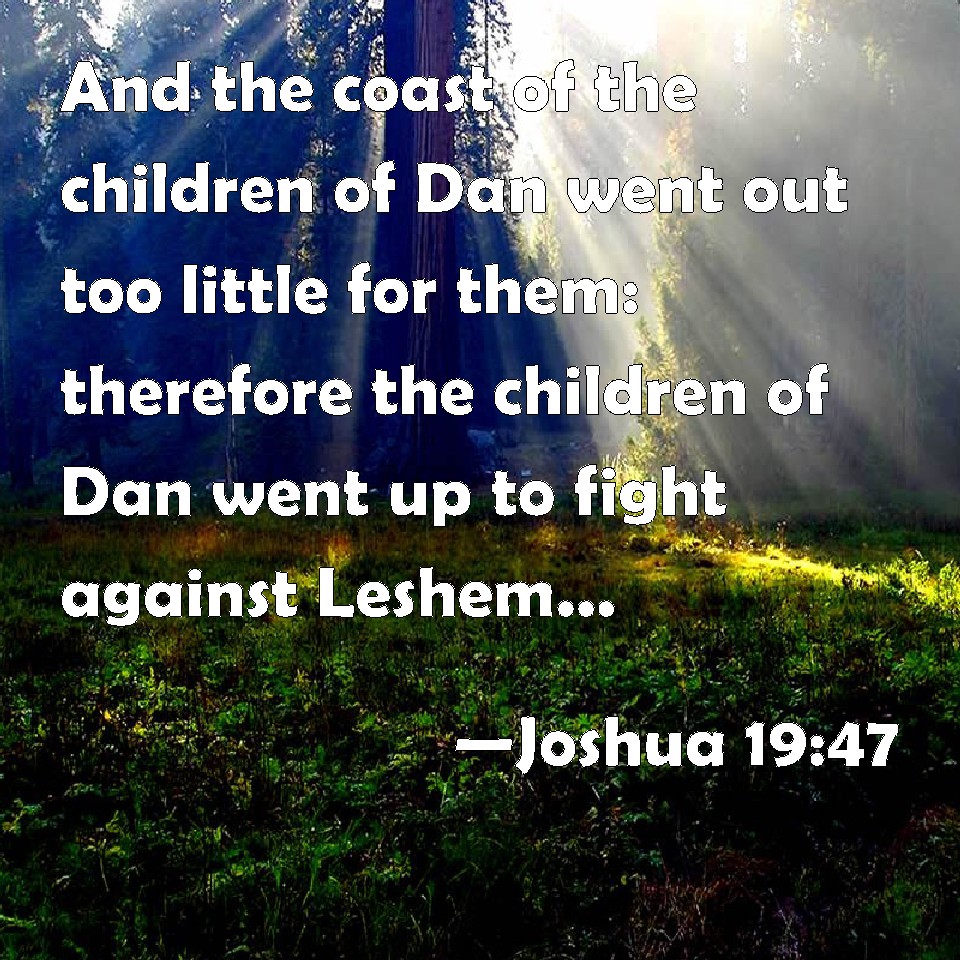 Choose a Background Joshua 19:47 And the coast of the children of Dan went out too little for them: therefore the children of Dan went up to fight against Leshem, and took it, and smote it with the edge of the sword, and possessed it, and dwelled therein, and called Leshem, Dan, after the name of Dan their father. KJV: And the coast of the children of Dan went out too little for them: therefore the children of Dan went up to fight against Leshem, and took it, and smote it with the edge of the sword, and possessed it, and dwelt therein, and called Leshem, Dan, after the name of Dan their father. DRB: And is terminated there. And the children of Dan went up and fought against Lesem, and took it: and they put it to the sword, and possessed it, and dwelt in it, calling the name of it Lesem Dan, by the name of Dan their father. DBT: And the border of the children of Dan ended with these; and the children of Dan went up and fought against Leshem, and took it, and smote it with the edge of the sword, and took possession of it, and dwelt in it, and called Leshem, Dan, after the name of Dan their father. ERV: And the border of the children of Dan went out beyond them: for the children of Dan went up and fought against Leshem, and took it, and smote it with the edge of the sword, and possessed it, and dwelt therein, and called Leshem, Dan, after the name of Dan their father. WBT: And the border of the children of Dan, went out too little for them: therefore the children of Dan went up to fight against Leshem, and took it, and smote it with the edge of the sword, and possessed it, and dwelt in it, and called Leshem, Dan, after the name of Dan their father. WEB: The border of the children of Dan went out beyond them; for the children of Dan went up and fought against Leshem, and took it, and struck it with the edge of the sword, and possessed it, and lived therein, and called Leshem, Dan, after the name of Dan their father. YLT: And the border of the sons of Dan goeth out from them, and the sons of Dan go up and fight with Leshem, and capture it, and smite it by the mouth of the sword, and possess it, and dwell in it, and call Leshem, Dan, according to the name of Dan their father.Links Joshua 19:47 NIV • Joshua 19:47 NLT • Joshua 19:47 ESV • Joshua 19:47 NASB • Joshua 19:47 KJV • Joshua 19:47 Interlinear • Joshua 19:47 Commentaries • Joshua 19:47 Parallel Texts • Joshua 19:47 Bible Apps • Joshua 19:47 Parallel • Bible Hub |