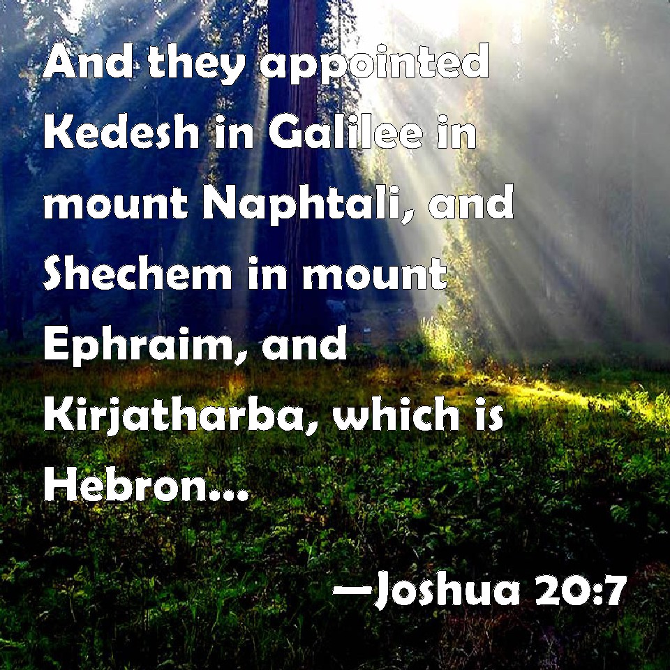 Choose a Background Joshua 20:7 And they appointed Kedesh in Galilee in mount Naphtali, and Shechem in mount Ephraim, and Kirjatharba, which is Hebron, in the mountain of Judah. KJV: And they appointed Kedesh in Galilee in mount Naphtali, and Shechem in mount Ephraim, and Kirjatharba, which is Hebron, in the mountain of Judah. DRB: And they appointed Cedes in Galilee of mount Nephtali, and Sichem in mount Ephraim, and Cariath-Arbe, the same is Hebron in the mountain of Juda. DBT: And they hallowed Kedesh in Galilee in the hill-country of Naphtali, and Shechem in the hill-country of Ephraim, and Kirjath-Arba, that is, Hebron, in the hill-country of Judah. ERV: And they set apart Kedesh in Galilee in the hill country of Naphtali, and Shechem in the hill country of Ephraim, and Kiriath-arba (the same is Hebron) in the hill country of Judah. WBT: And they appointed Kedesh in Galilee in mount Naphtali, and Shechem in mount Ephraim, and Kirjath-arba, (which is Hebron) in the mountain of Judah. WEB: They set apart Kedesh in Galilee in the hill country of Naphtali, Shechem in the hill country of Ephraim, and Kiriath Arba (the same is Hebron) in the hill country of Judah. YLT: And they sanctify Kedesh in Galilee, in the hill-country of Naphtali, and Shechem in the hill-country of Ephraim, and Kirjath-Arba (it is Hebron), in the hill-country of Judah;Links Joshua 20:7 NIV • Joshua 20:7 NLT • Joshua 20:7 ESV • Joshua 20:7 NASB • Joshua 20:7 KJV • Joshua 20:7 Interlinear • Joshua 20:7 Commentaries • Joshua 20:7 Parallel Texts • Joshua 20:7 Bible Apps • Joshua 20:7 Parallel • Bible Hub |