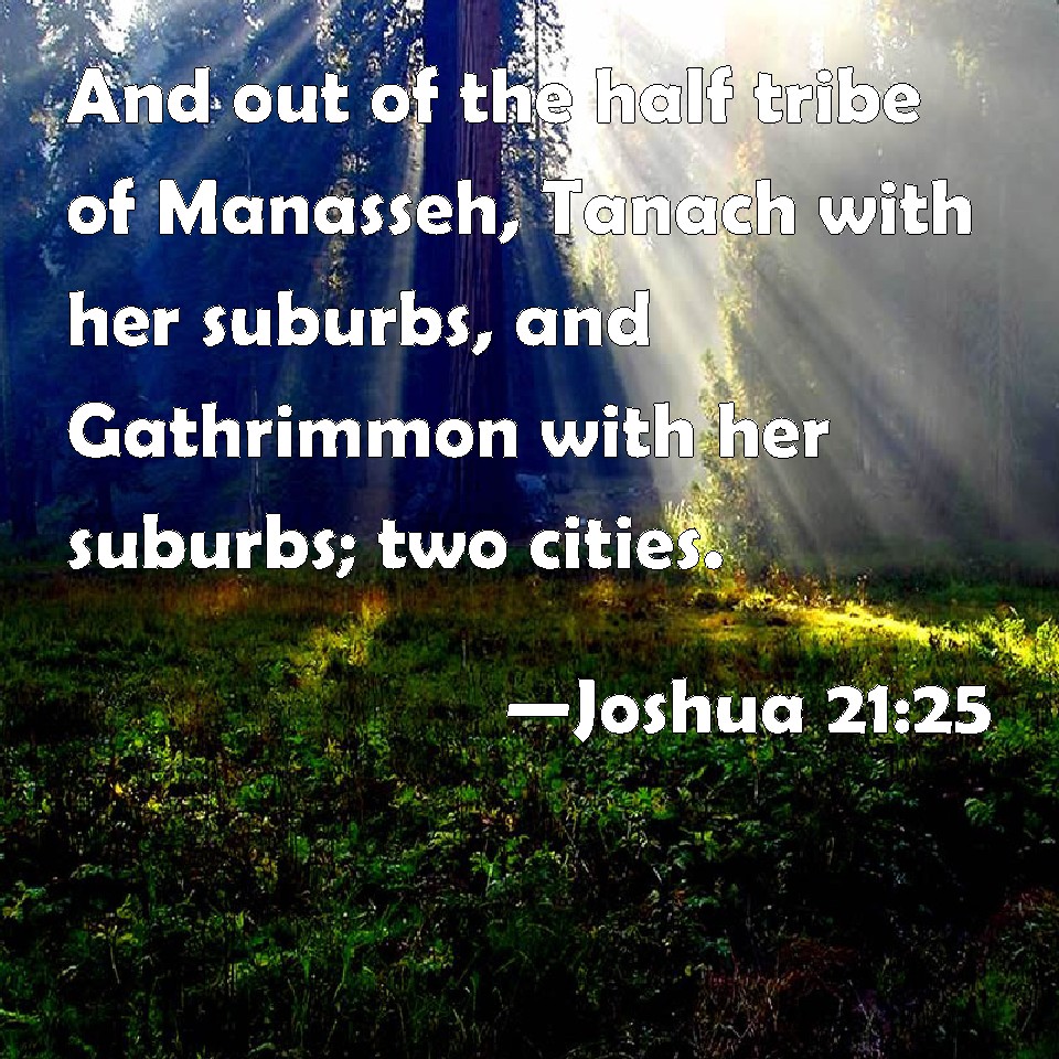 Choose a Background Joshua 21:25 And out of the half tribe of Manasseh, Tanach with her suburbs, and Gathrimmon with her suburbs; two cities. KJV: And out of the half tribe of Manasseh, Tanach with her suburbs, and Gathrimmon with her suburbs; two cities. DRB: And of the half tribe of Manasses, Thanac and Gethremmon, with their suburbs, two cities. DBT: and out of half the tribe of Manasseh, Taanach and its suburbs and Gath-Rimmon and its suburbs: two cities. ERV: And out of the half tribe of Manasseh, Taanach with her suburbs, and Gath-rimmon with her suburbs; two cities. WBT: And out of the half-tribe of Manasseh, Taanach with its suburbs, and Gath-rimmon with its suburbs; two cities. WEB: Out of the half-tribe of Manasseh, Taanach with its suburbs, and Gath Rimmon with its suburbs; two cities. YLT: And out of the half of the tribe of Manasseh, Taanach and its suburbs, and Gath-Rimmon and its suburbs — two cities;Links Joshua 21:25 NIV • Joshua 21:25 NLT • Joshua 21:25 ESV • Joshua 21:25 NASB • Joshua 21:25 KJV • Joshua 21:25 Interlinear • Joshua 21:25 Commentaries • Joshua 21:25 Parallel Texts • Joshua 21:25 Bible Apps • Joshua 21:25 Parallel • Bible Hub |