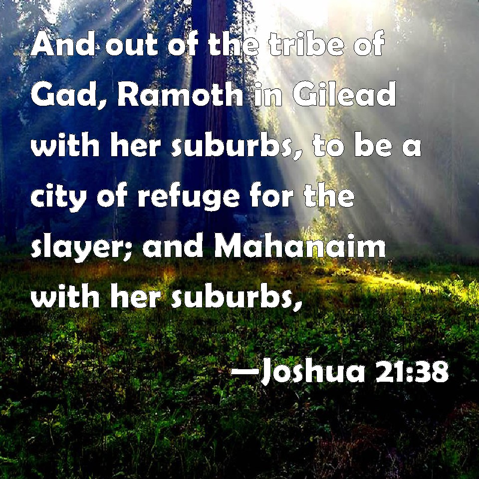 Choose a Background Joshua 21:38 And out of the tribe of Gad, Ramoth in Gilead with her suburbs, to be a city of refuge for the slayer; and Mahanaim with her suburbs, KJV: And out of the tribe of Gad, Ramoth in Gilead with her suburbs, to be a city of refuge for the slayer; and Mahanaim with her suburbs, DRB: Of the tribe of Gad, Ramoth in Galaad, one of the cities of refuge, and Manaim DBT: and out of the tribe of Gad, the city of refuge for the slayer, Ramoth in Gilead and its suburbs; and Mahanaim and its suburbs, ERV: And out of the tribe of Gad, Ramoth in Gilead with her suburbs, the city of refuge for the manslayer, and Mahanaim with her suburbs; WBT: And out of the tribe of Gad, Ramoth in Gilead with its suburbs to be a city of refuge for the slayer; and Mahanaim with its suburbs, WEB: Out of the tribe of Gad, Ramoth in Gilead with its suburbs, the city of refuge for the manslayer, and Mahanaim with its suburbs, YLT: And out of the tribe of Gad, the city of refuge for the man-slayer, Ramoth in Gilead and its suburbs, and Mahanaim and its suburbs,Links Joshua 21:38 NIV • Joshua 21:38 NLT • Joshua 21:38 ESV • Joshua 21:38 NASB • Joshua 21:38 KJV • Joshua 21:38 Interlinear • Joshua 21:38 Commentaries • Joshua 21:38 Parallel Texts • Joshua 21:38 Bible Apps • Joshua 21:38 Parallel • Bible Hub |