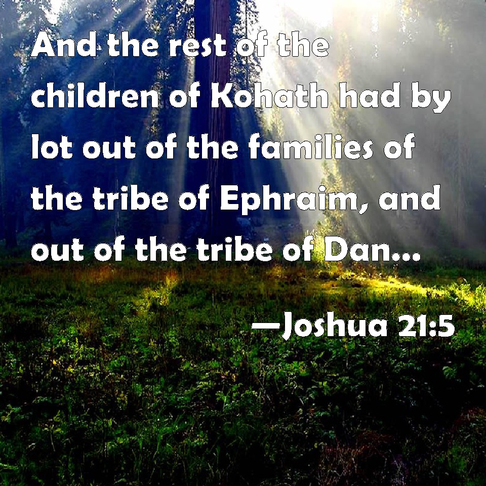 Choose a Background Joshua 21:5 And the rest of the children of Kohath had by lot out of the families of the tribe of Ephraim, and out of the tribe of Dan, and out of the half tribe of Manasseh, ten cities. KJV: And the rest of the children of Kohath had by lot out of the families of the tribe of Ephraim, and out of the tribe of Dan, and out of the half tribe of Manasseh, ten cities. DRB: And to the rest of the children of Caath, that is, to the Levites, who remained, out of the tribes of Ephraim, and of Dan, and the half tribe of Manasses, ten cities. DBT: And the children of Kohath that remained had by lot out of the families of the tribe of Ephraim, and out of the tribe of Dan, and out of the half tribe of Manasseh, ten cities. ERV: And the rest of the children of Kohath had by lot out of the families of the tribe of Ephraim, and out of the tribe of Dan, and out of the half tribe of Manasseh, ten cities. WBT: And the rest of the children of Kohath had by lot out of the families of the tribe of Ephraim, and out of the tribe of Dan, and out of the half-tribe of Manasseh, ten cities. WEB: The rest of the children of Kohath had ten cities by lot out of the families of the tribe of Ephraim, out of the tribe of Dan, and out of the half-tribe of Manasseh. YLT: and for the sons of Kohath who are left, out of the families of the tribe of Ephraim, and out of the tribe of Dan, and out of the half of the tribe of Manasseh, by lot ten cities:Links Joshua 21:5 NIV • Joshua 21:5 NLT • Joshua 21:5 ESV • Joshua 21:5 NASB • Joshua 21:5 KJV • Joshua 21:5 Interlinear • Joshua 21:5 Commentaries • Joshua 21:5 Parallel Texts • Joshua 21:5 Bible Apps • Joshua 21:5 Parallel • Bible Hub |