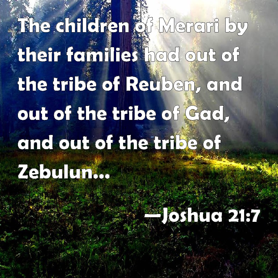 Choose a Background Joshua 21:7 The children of Merari by their families had out of the tribe of Reuben, and out of the tribe of Gad, and out of the tribe of Zebulun, twelve cities. KJV: The children of Merari by their families had out of the tribe of Reuben, and out of the tribe of Gad, and out of the tribe of Zebulun, twelve cities. DRB: And to the sons of Merari by their kindreds, of the tribes of Ruben and or Cad and of Zabulon, twelve cities. DBT: The children of Merari according to their families had by lot out of the tribe of Reuben, and out of the tribe of Gad, and out of the tribe of Zebulun, twelve cities. ERV: The children of Merari according to their families had out of the tribe of Reuben, and out of the tribe of Gad, and out of the tribe of Zebulun, twelve cities. WBT: The children of Merari by their families had out of the tribe of Reuben, and out of the tribe of Gad, and out of the tribe of Zebulun, twelve cities. WEB: The children of Merari according to their families had twelve cities out of the tribe of Reuben, out of the tribe of Gad, and out of the tribe of Zebulun. YLT: For the sons of Merari, for their families, are, out of the tribe of Reuben, and out of the tribe of Gad, and out of the tribe of Zebulun, twelve cities.Links Joshua 21:7 NIV • Joshua 21:7 NLT • Joshua 21:7 ESV • Joshua 21:7 NASB • Joshua 21:7 KJV • Joshua 21:7 Interlinear • Joshua 21:7 Commentaries • Joshua 21:7 Parallel Texts • Joshua 21:7 Bible Apps • Joshua 21:7 Parallel • Bible Hub |