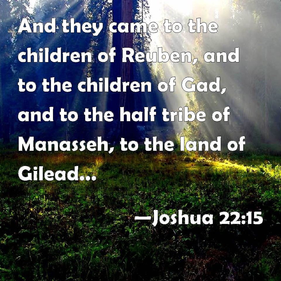 Choose a Background Joshua 22:15 And they came to the children of Reuben, and to the children of Gad, and to the half tribe of Manasseh, to the land of Gilead, and they spoke with them, saying, KJV: And they came unto the children of Reuben, and to the children of Gad, and to the half tribe of Manasseh, unto the land of Gilead, and they spake with them, saying, DRB: Who came to the children of Ruben, and of Gad, and the half tribe of Manasses, into the land of Galaad, and said to them: DBT: And they came to the children of Reuben, and to the children of Gad, and to the half tribe of Manasseh, to the land of Gilead, and spoke with them, saying, ERV: And they came unto the children of Reuben, and to the children of Gad, and to the half tribe of Manasseh, unto the land of Gilead, and they spake with them, saying, WBT: And they came to the children of Reuben, and to the children of Gad, and to the half-tribe of Manasseh, to the land of Gilead, and they spoke with them, saying, WEB: They came to the children of Reuben, and to the children of Gad, and to the half-tribe of Manasseh, to the land of Gilead, and they spoke with them, saying, YLT: And they come in unto the sons of Reuben, and unto the sons of Gad, and unto the half of the tribe of Manasseh, unto the land of Gilead, and speak with them, saying,Links Joshua 22:15 NIV • Joshua 22:15 NLT • Joshua 22:15 ESV • Joshua 22:15 NASB • Joshua 22:15 KJV • Joshua 22:15 Interlinear • Joshua 22:15 Commentaries • Joshua 22:15 Parallel Texts • Joshua 22:15 Bible Apps • Joshua 22:15 Parallel • Bible Hub |