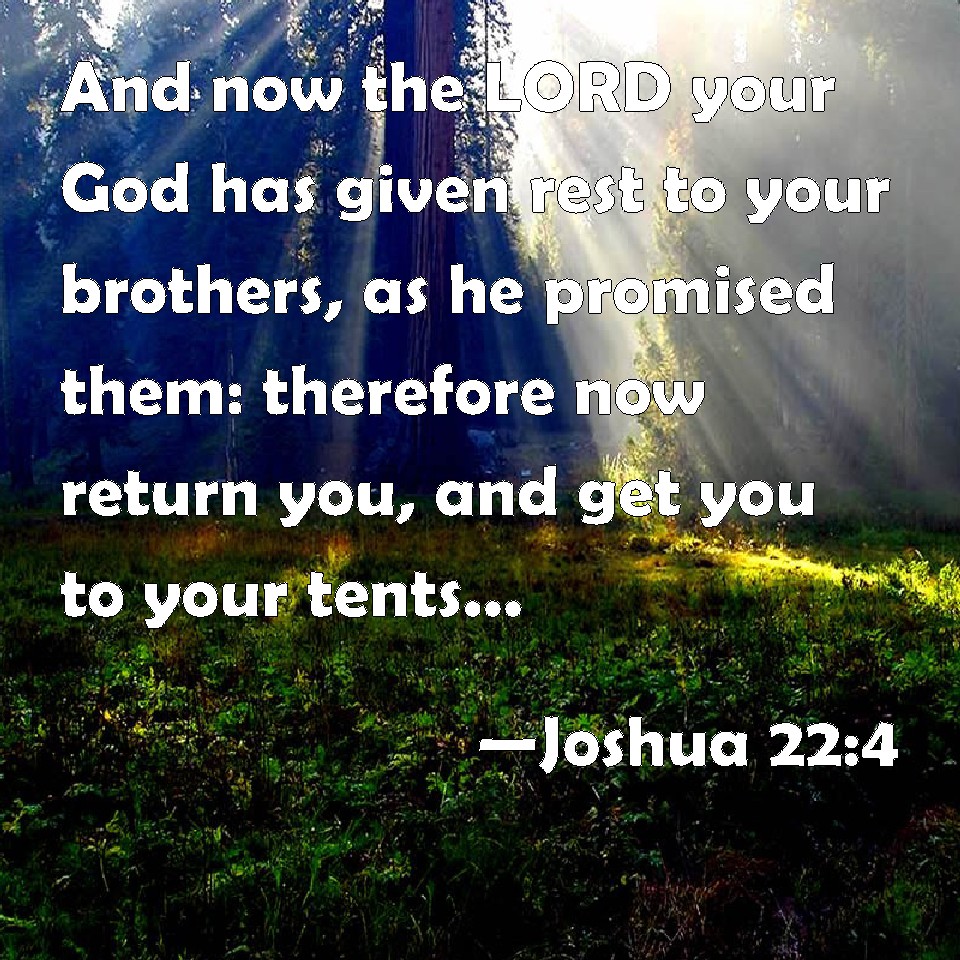 Choose a Background Joshua 22:4 And now the LORD your God has given rest to your brothers, as he promised them: therefore now return you, and get you to your tents, and to the land of your possession, which Moses the servant of the LORD gave you on the other side Jordan. KJV: And now the LORD your God hath given rest unto your brethren, as he promised them: therefore now return ye, and get you unto your tents, and unto the land of your possession, which Moses the servant of the LORD gave you on the other side Jordan. DRB: Therefore as the Lord your God hath given your brethren rest and peace, as he promised: return, and go to your dwellings, and to the land of your possession, which Moses the servant of the Lord gave you beyond the Jordan: DBT: And now Jehovah your God hath given rest to your brethren, as he said unto them; and now return, and get you unto your tents, unto the land of your possession, which Moses the servant of Jehovah gave you beyond the Jordan. ERV: And now the LORD your God hath given rest unto your brethren, as he spake unto them: therefore now turn ye, and get you unto your tents, unto the land of your possession, which Moses the servant of the LORD gave you beyond Jordan. WBT: And now the LORD your God hath given rest to your brethren, as he promised them: therefore now return ye, and go to your tents, and to the land of your possession, which Moses the servant of the LORD gave you on the other side of Jordan. WEB: Now Yahweh your God has given rest to your brothers, as he spoke to them. Therefore now return and go to your tents, to the land of your possession, which Moses the servant of Yahweh gave you beyond the Jordan. YLT: 'And, now, Jehovah your God hath given rest to your brethren, as He spake to them; and now, turn ye, and go for yourselves to your tents, unto the land of your possession, which Moses, servant of Jehovah, hath given to you beyond the Jordan.Links Joshua 22:4 NIV • Joshua 22:4 NLT • Joshua 22:4 ESV • Joshua 22:4 NASB • Joshua 22:4 KJV • Joshua 22:4 Interlinear • Joshua 22:4 Commentaries • Joshua 22:4 Parallel Texts • Joshua 22:4 Bible Apps • Joshua 22:4 Parallel • Bible Hub |