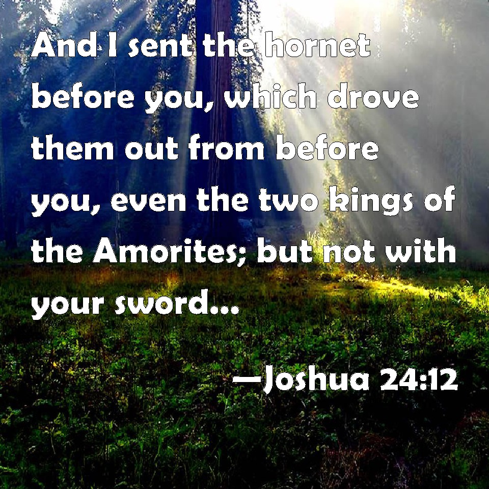Choose a Background Joshua 24:12 And I sent the hornet before you, which drove them out from before you, even the two kings of the Amorites; but not with your sword, nor with your bow. KJV: And I sent the hornet before you, which drave them out from before you, even the two kings of the Amorites; but not with thy sword, nor with thy bow. DRB: And I sent before you hornets: and I drove them out from their places, the two kings of the Amorrhites, not with thy sword nor with thy bow. DBT: And I sent the hornet before you, which drove them out from before you, as the two kings of the Amorites; not with thy sword, nor with thy bow. ERV: And I sent the hornet before you, which drave them out from before you, even the two kings of the Amorites; not with thy sword, nor with thy bow. WBT: And I sent the hornet before you, which drove them out from before you, even the two kings of the Amorites; but not with thy sword, nor with thy bow. WEB: I sent the hornet before you, which drove them out from before you, even the two kings of the Amorites; not with your sword, nor with your bow. YLT: And I send before you the hornet, and it casteth them out from your presence — two kings of the Amorite — not by thy sword, nor by thy bow.Links Joshua 24:12 NIV • Joshua 24:12 NLT • Joshua 24:12 ESV • Joshua 24:12 NASB • Joshua 24:12 KJV • Joshua 24:12 Interlinear • Joshua 24:12 Commentaries • Joshua 24:12 Parallel Texts • Joshua 24:12 Bible Apps • Joshua 24:12 Parallel • Bible Hub |