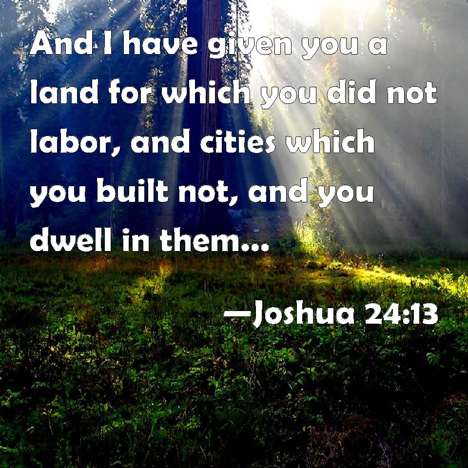 Choose a Background Joshua 24:13 And I have given you a land for which you did not labor, and cities which you built not, and you dwell in them; of the vineyards and olive groves which you planted not do you eat. KJV: And I have given you a land for which ye did not labour, and cities which ye built not, and ye dwell in them; of the vineyards and oliveyards which ye planted not do ye eat. DRB: And I gave you a land, in which you had not laboured, and cities to dwell in which you built not, vineyards and oliveyards, which you planted not. DBT: And I have given you a land for which ye did not labour, and cities which ye built not, and ye dwell in them; of vineyards and oliveyards which ye planted not do ye eat. ERV: And I gave you a land whereon thou hadst not laboured, and cities which ye built not, and ye dwell therein; of vineyards and oliveyards which ye planted not do ye eat. WBT: And I have given you a land for which ye did not labor, and cities which ye built not, and ye dwell in them; of the vineyards and olive-yards which ye planted not do ye eat. WEB: I gave you a land whereon you had not labored, and cities which you didn't build, and you live in them. You eat of vineyards and olive groves which you didn't plant.' YLT: 'And I give to you a land for which thou hast not laboured, and cities which ye have not built, and ye dwell in them; of vineyards and olive-yards which ye have not planted ye are eating.Links Joshua 24:13 NIV • Joshua 24:13 NLT • Joshua 24:13 ESV • Joshua 24:13 NASB • Joshua 24:13 KJV • Joshua 24:13 Interlinear • Joshua 24:13 Commentaries • Joshua 24:13 Parallel Texts • Joshua 24:13 Bible Apps • Joshua 24:13 Parallel • Bible Hub |