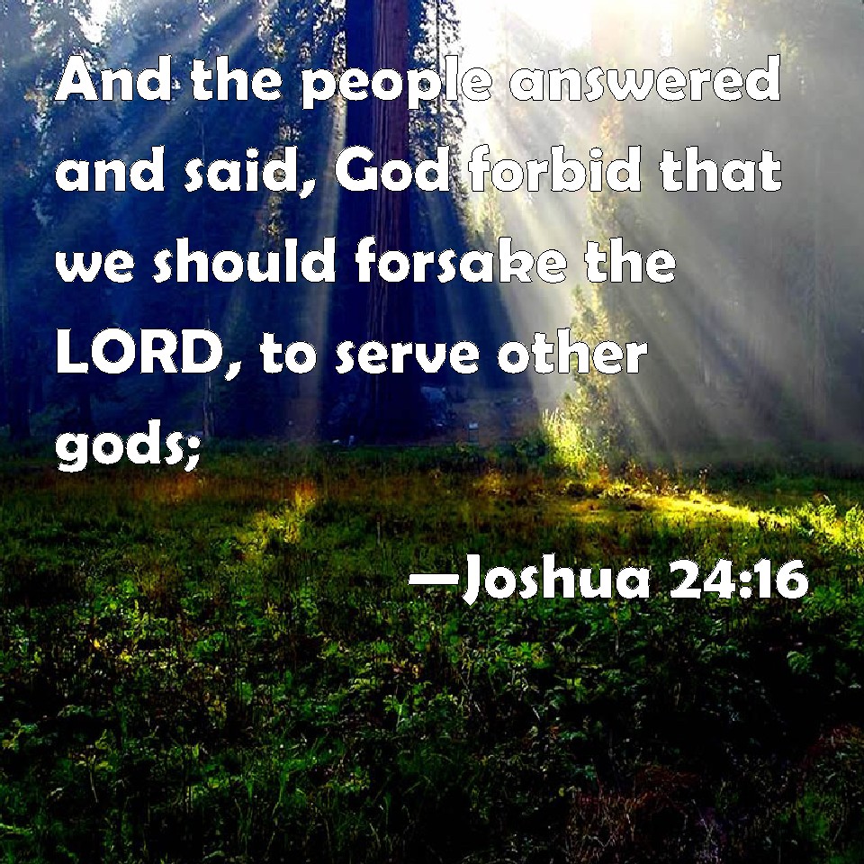 Choose a Background Joshua 24:16 And the people answered and said, God forbid that we should forsake the LORD, to serve other gods; KJV: And the people answered and said, God forbid that we should forsake the LORD, to serve other gods; DRB: And the people answered, and said: God forbid we should leave the Lord, and serve strange gods. DBT: And the people answered and said, Far be it from us that we should forsake Jehovah, to serve other gods; ERV: And the people answered and said, God forbid that we should forsake the LORD, to serve other gods; WBT: And the people answered, and said, Be it far from us that we should forsake the LORD, to serve other gods; WEB: The people answered, "Far be it from us that we should forsake Yahweh, to serve other gods; YLT: And the people answer and say, 'Far be it from us to forsake Jehovah, to serve other gods;Links Joshua 24:16 NIV • Joshua 24:16 NLT • Joshua 24:16 ESV • Joshua 24:16 NASB • Joshua 24:16 KJV • Joshua 24:16 Interlinear • Joshua 24:16 Commentaries • Joshua 24:16 Parallel Texts • Joshua 24:16 Bible Apps • Joshua 24:16 Parallel • Bible Hub |