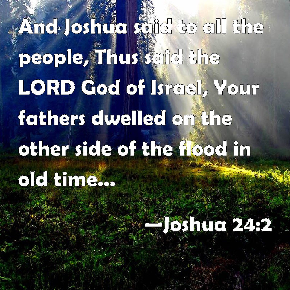 Choose a Background Joshua 24:2 And Joshua said to all the people, Thus said the LORD God of Israel, Your fathers dwelled on the other side of the flood in old time, even Terah, the father of Abraham, and the father of Nachor: and they served other gods. KJV: And Joshua said unto all the people, Thus saith the LORD God of Israel, Your fathers dwelt on the other side of the flood in old time, even Terah, the father of Abraham, and the father of Nachor: and they served other gods. DRB: And he spoke thus to the people: Thus saith the Lord the God of Israel: Your fathers dwelt of old on the other side of the river, Thare the father of Abraham, and Nachor: and they served strange gods. DBT: And Joshua said unto all the people, Thus saith Jehovah the God of Israel: Your fathers dwelt of old on the other side of the river, Terah, the father of Abraham and the father of Nahor, and they served other gods. ERV: And Joshua said unto all the people, Thus saith the LORD, the God of Israel, Your fathers dwelt of old time beyond the River, even Terah, the father of Abraham, and the father of Nahor: and they served other gods. WBT: And Joshua said to all the people, Thus saith the LORD God of Israel, Your fathers dwelt on the other side of the flood in old time, even Terah, the father of Abraham, and the father of Nahor: and they served other gods. WEB: Joshua said to all the people, "Thus says Yahweh, the God of Israel, 'Your fathers lived of old time beyond the River, even Terah, the father of Abraham, and the father of Nahor: and they served other gods. YLT: And Joshua saith unto all the people, 'Thus said Jehovah, God of Israel, Beyond the River have your fathers dwelt of old — Terah father of Abraham and father of Nachor — and they serve other gods;Links Joshua 24:2 NIV • Joshua 24:2 NLT • Joshua 24:2 ESV • Joshua 24:2 NASB • Joshua 24:2 KJV • Joshua 24:2 Interlinear • Joshua 24:2 Commentaries • Joshua 24:2 Parallel Texts • Joshua 24:2 Bible Apps • Joshua 24:2 Parallel • Bible Hub |