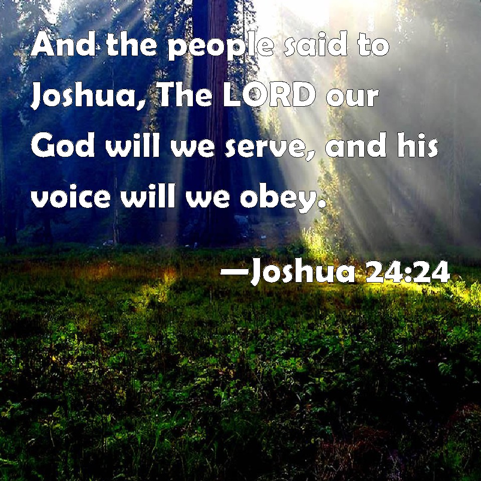Choose a Background Joshua 24:24 And the people said to Joshua, The LORD our God will we serve, and his voice will we obey. KJV: And the people said unto Joshua, The LORD our God will we serve, and his voice will we obey. DRB: And the people said to Josue: We will serve the Lord our God, and we will be obedient to his commandments. DBT: And the people said unto Joshua, Jehovah our God will we serve, and to his voice will we hearken. ERV: And the people said unto Joshua, The LORD our God will we serve, and unto his voice will we hearken. WBT: And the people said to Joshua, The LORD our God will we serve, and his voice will we obey. WEB: The people said to Joshua, "We will serve Yahweh our God, and we will listen to his voice." YLT: And the people say unto Joshua, 'Jehovah our God we serve, and to His voice we hearken.'Links Joshua 24:24 NIV • Joshua 24:24 NLT • Joshua 24:24 ESV • Joshua 24:24 NASB • Joshua 24:24 KJV • Joshua 24:24 Interlinear • Joshua 24:24 Commentaries • Joshua 24:24 Parallel Texts • Joshua 24:24 Bible Apps • Joshua 24:24 Parallel • Bible Hub |