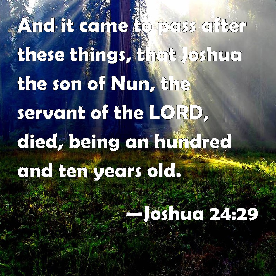 Choose a Background Joshua 24:29 And it came to pass after these things, that Joshua the son of Nun, the servant of the LORD, died, being an hundred and ten years old. KJV: And it came to pass after these things, that Joshua the son of Nun, the servant of the LORD, died, being an hundred and ten years old. DRB: And after these things Josue the son of Nun the servant of the Lord died, being a hundred and ten years old: DBT: And it came to pass after these things, that Joshua the son of Nun, the servant of Jehovah, died, a hundred and ten years old. ERV: And it came to pass after these things, that Joshua the son of Nun, the servant of the LORD, died, being an hundred and ten years old. WBT: And it came to pass after these things, that Joshua the son of Nun the servant of the LORD died, being a hundred and ten years old. WEB: It happened after these things, that Joshua the son of Nun, the servant of Yahweh, died, being one hundred and ten years old. YLT: And it cometh to pass, after these things, that Joshua son of Nun, servant of Jehovah, dieth, a son of a hundred and ten years,Links Joshua 24:29 NIV • Joshua 24:29 NLT • Joshua 24:29 ESV • Joshua 24:29 NASB • Joshua 24:29 KJV • Joshua 24:29 Interlinear • Joshua 24:29 Commentaries • Joshua 24:29 Parallel Texts • Joshua 24:29 Bible Apps • Joshua 24:29 Parallel • Bible Hub |