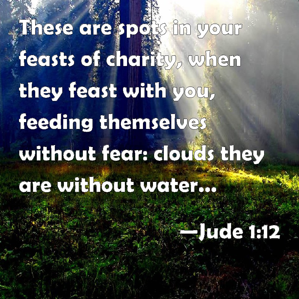 Choose a Background Jude 1:12 These are spots in your feasts of charity, when they feast with you, feeding themselves without fear: clouds they are without water, carried about of winds; trees whose fruit wither, without fruit, twice dead, plucked up by the roots; KJV: These are spots in your feasts of charity, when they feast with you, feeding themselves without fear: clouds they are without water, carried about of winds; trees whose fruit withereth, without fruit, twice dead, plucked up by the roots; DRB: These are spots in their banquets, feasting together without fear, feeding themselves, clouds without water, which are carried about by winds, trees of the autumn, unfruitful, twice dead, plucked up by the roots, DBT: These are spots in your love-feasts, feasting together with you without fear, pasturing themselves; clouds without water, carried along by the winds; autumnal trees, without fruit, twice dead, rooted up; ERV: These are they who are hidden rocks in your love-feasts when they feast with you, shepherds that without fear feed themselves; clouds without water, carried along by winds; autumn trees without fruit, twice dead, plucked up by the roots; WBT: These are spots in your feasts of charity, when they feast with you, feeding themselves without fear: clouds they are without water, carried about by winds; withered autumnal trees, without fruit, twice dead, plucked out by the roots; WEB: These are hidden rocky reefs in your love feasts when they feast with you, shepherds who without fear feed themselves; clouds without water, carried along by winds; autumn leaves without fruit, twice dead, plucked up by the roots; YLT: These are in your love-feasts craggy rocks; feasting together with you, without fear shepherding themselves; clouds without water, by winds carried about; trees autumnal, without fruit, twice dead, rooted up;Links Jude 1:12 NIV • Jude 1:12 NLT • Jude 1:12 ESV • Jude 1:12 NASB • Jude 1:12 KJV • Jude 1:12 Interlinear • Jude 1:12 Commentaries • Jude 1:12 Parallel Texts • Jude 1:12 Bible Apps • Jude 1:12 Parallel • Bible Hub |