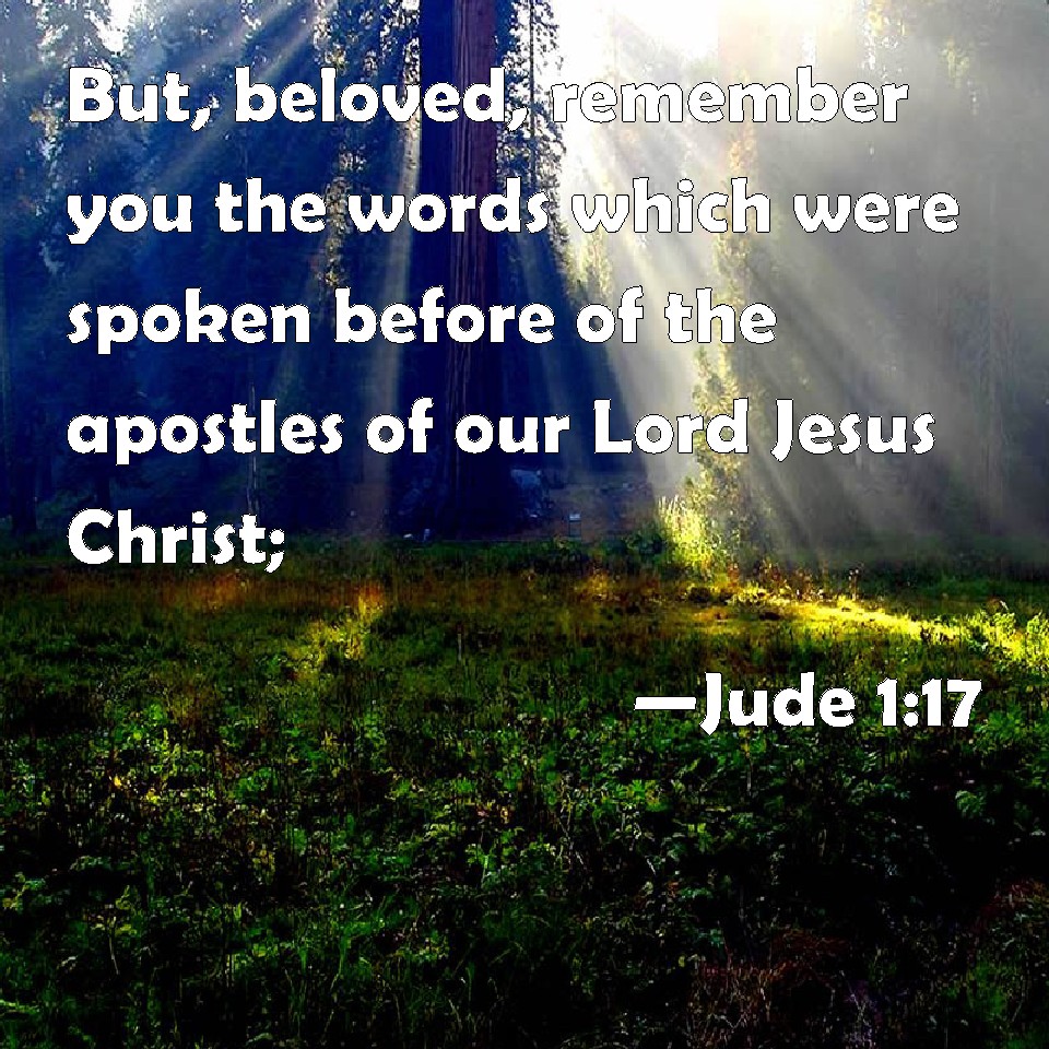 Choose a Background Jude 1:17 But, beloved, remember you the words which were spoken before of the apostles of our Lord Jesus Christ; KJV: But, beloved, remember ye the words which were spoken before of the apostles of our Lord Jesus Christ; DRB: But you, my dearly beloved, be mindful of the words which have been spoken before by the apostles of our Lord Jesus Christ, DBT: But ye, beloved, remember the words spoken before by the apostles of our Lord Jesus Christ, ERV: But ye, beloved, remember ye the words which have been spoken before by the apostles of our Lord Jesus Christ; WBT: But, beloved, remember ye the words which were spoken before by the apostles of our Lord Jesus Christ; WEB: But you, beloved, remember the words which have been spoken before by the apostles of our Lord Jesus Christ. YLT: and ye, beloved, remember ye the sayings spoken before by the apostles of our Lord Jesus Christ:Links Jude 1:17 NIV • Jude 1:17 NLT • Jude 1:17 ESV • Jude 1:17 NASB • Jude 1:17 KJV • Jude 1:17 Interlinear • Jude 1:17 Commentaries • Jude 1:17 Parallel Texts • Jude 1:17 Bible Apps • Jude 1:17 Parallel • Bible Hub |