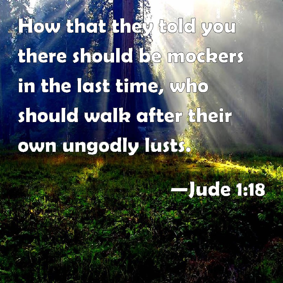 Choose a Background Jude 1:18 How that they told you there should be mockers in the last time, who should walk after their own ungodly lusts. KJV: How that they told you there should be mockers in the last time, who should walk after their own ungodly lusts. DRB: Who told you, that in the last time there should come mockers, walking according to their own desires in ungodlinesses. DBT: that they said to you, that at the end of the time there should be mockers, walking after their own lusts of ungodlinesses. ERV: how that they said to you, In the last time there shall be mockers, walking after their own ungodly lusts. WBT: That they told you there would be mockers in the last time, who would walk after their own ungodly lusts. WEB: They said to you that "In the last time there will be mockers, walking after their own ungodly lusts." YLT: that they said to you, that in the last time there shall be scoffers, after their own desires of impieties going on,Links Jude 1:18 NIV • Jude 1:18 NLT • Jude 1:18 ESV • Jude 1:18 NASB • Jude 1:18 KJV • Jude 1:18 Interlinear • Jude 1:18 Commentaries • Jude 1:18 Parallel Texts • Jude 1:18 Bible Apps • Jude 1:18 Parallel • Bible Hub |