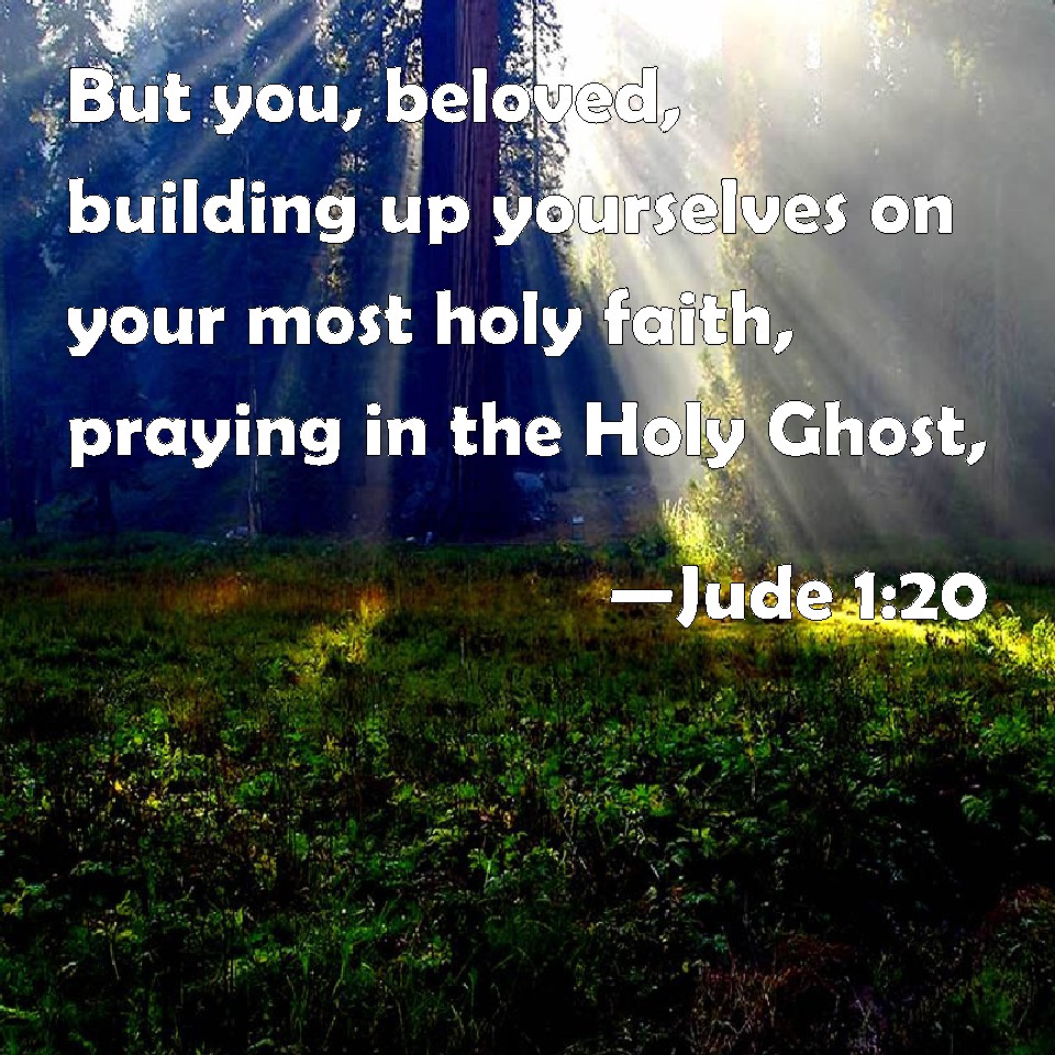Choose a Background Jude 1:20 But you, beloved, building up yourselves on your most holy faith, praying in the Holy Ghost, KJV: But ye, beloved, building up yourselves on your most holy faith, praying in the Holy Ghost, DRB: But you, my beloved, building yourselves upon you most holy faith, praying in the Holy Ghost, DBT: But ye, beloved, building yourselves up on your most holy faith, praying in the Holy Spirit, ERV: But ye, beloved, building up yourselves on your most holy faith, praying in the Holy Spirit, WBT: But ye, beloved, building up yourselves on your most holy faith, praying by the Holy Spirit, WEB: But you, beloved, keep building up yourselves on your most holy faith, praying in the Holy Spirit. YLT: And ye, beloved, on your most holy faith building yourselves up, in the Holy Spirit praying,Links Jude 1:20 NIV • Jude 1:20 NLT • Jude 1:20 ESV • Jude 1:20 NASB • Jude 1:20 KJV • Jude 1:20 Interlinear • Jude 1:20 Commentaries • Jude 1:20 Parallel Texts • Jude 1:20 Bible Apps • Jude 1:20 Parallel • Bible Hub |