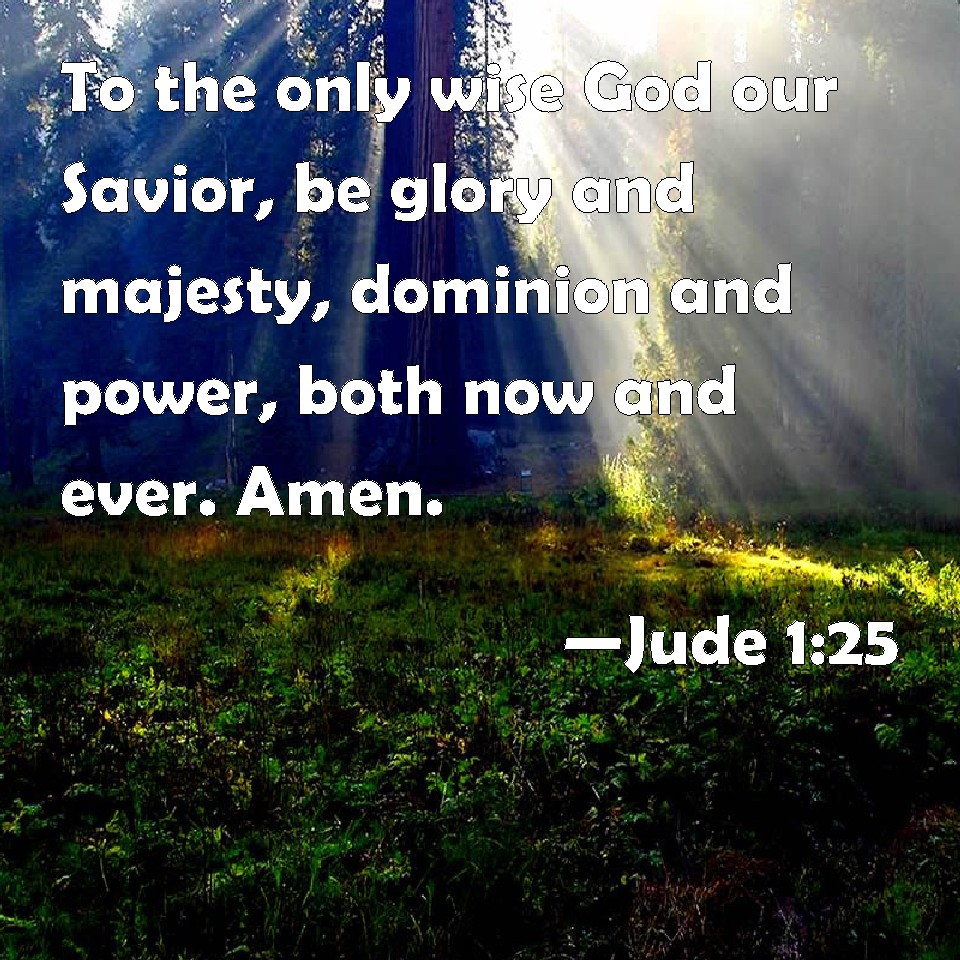 Choose a Background Jude 1:25 To the only wise God our Savior, be glory and majesty, dominion and power, both now and ever. Amen. KJV: To the only wise God our Saviour, be glory and majesty, dominion and power, both now and ever. Amen. DRB: To the only God our Saviour through Jesus Christ our Lord, be glory and magnificence, empire and power, before all ages, and now, and for all ages of ages. Amen. DBT: to the only God our Saviour, through Jesus Christ our Lord, be glory, majesty, might, and authority, from before the whole age, and now, and to all the ages. Amen. ERV: to the only God our Saviour, through Jesus Christ our Lord, be glory, majesty, dominion and power, before all time, and now, and for evermore. Amen. WBT: To God the only wise, our Savior, be glory and majesty, dominion and power, both now and ever. Amen. WEB: to God our Savior, who alone is wise, be glory and majesty, dominion and power, both now and forever. Amen. YLT: to the only wise God our Saviour, is glory and greatness, power and authority, both now and to all the ages! Amen.Links Jude 1:25 NIV • Jude 1:25 NLT • Jude 1:25 ESV • Jude 1:25 NASB • Jude 1:25 KJV • Jude 1:25 Interlinear • Jude 1:25 Commentaries • Jude 1:25 Parallel Texts • Jude 1:25 Bible Apps • Jude 1:25 Parallel • Bible Hub |