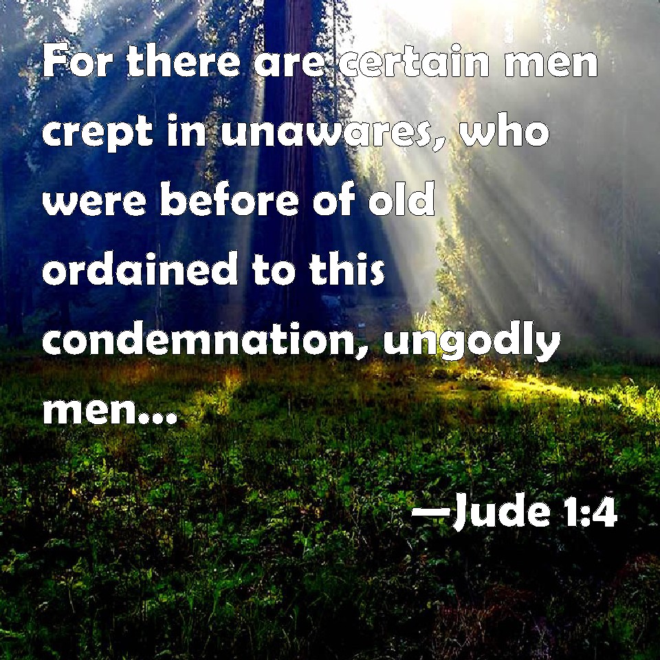 Choose a Background Jude 1:4 For there are certain men crept in unawares, who were before of old ordained to this condemnation, ungodly men, turning the grace of our God into lasciviousness, and denying the only Lord God, and our Lord Jesus Christ. KJV: For there are certain men crept in unawares, who were before of old ordained to this condemnation, ungodly men, turning the grace of our God into lasciviousness, and denying the only Lord God, and our Lord Jesus Christ. DRB: For certain men are secretly entered in, (who were written of long ago unto this judgment,) ungodly men, turning the grace of our Lord God into riotousness, and denying the only sovereign Ruler, and our Lord Jesus Christ. DBT: For certain men have got in unnoticed, they who of old were marked out beforehand to this sentence, ungodly persons, turning the grace of our God into dissoluteness, and denying our only Master and Lord Jesus Christ. ERV: For there are certain men crept in privily, even they who were of old set forth unto this condemnation, ungodly men, turning the grace of our God into lasciviousness, and denying our only Master and Lord, Jesus Christ. WBT: For certain men have crept in unawares, who were before of old ordained to this condemnation, ungodly men, turning the grace of our God into lasciviousness, and denying the only Lord God, and our Lord Jesus Christ. WEB: For there are certain men who crept in secretly, even those who were long ago written about for this condemnation: ungodly men, turning the grace of our God into indecency, and denying our only Master, God, and Lord, Jesus Christ. YLT: for there did come in unobserved certain men, long ago having been written beforehand to this judgment, impious, the grace of our God perverting to lasciviousness, and our only Master, God, and Lord — Jesus Christ — denying,Links Jude 1:4 NIV • Jude 1:4 NLT • Jude 1:4 ESV • Jude 1:4 NASB • Jude 1:4 KJV • Jude 1:4 Interlinear • Jude 1:4 Commentaries • Jude 1:4 Parallel Texts • Jude 1:4 Bible Apps • Jude 1:4 Parallel • Bible Hub |