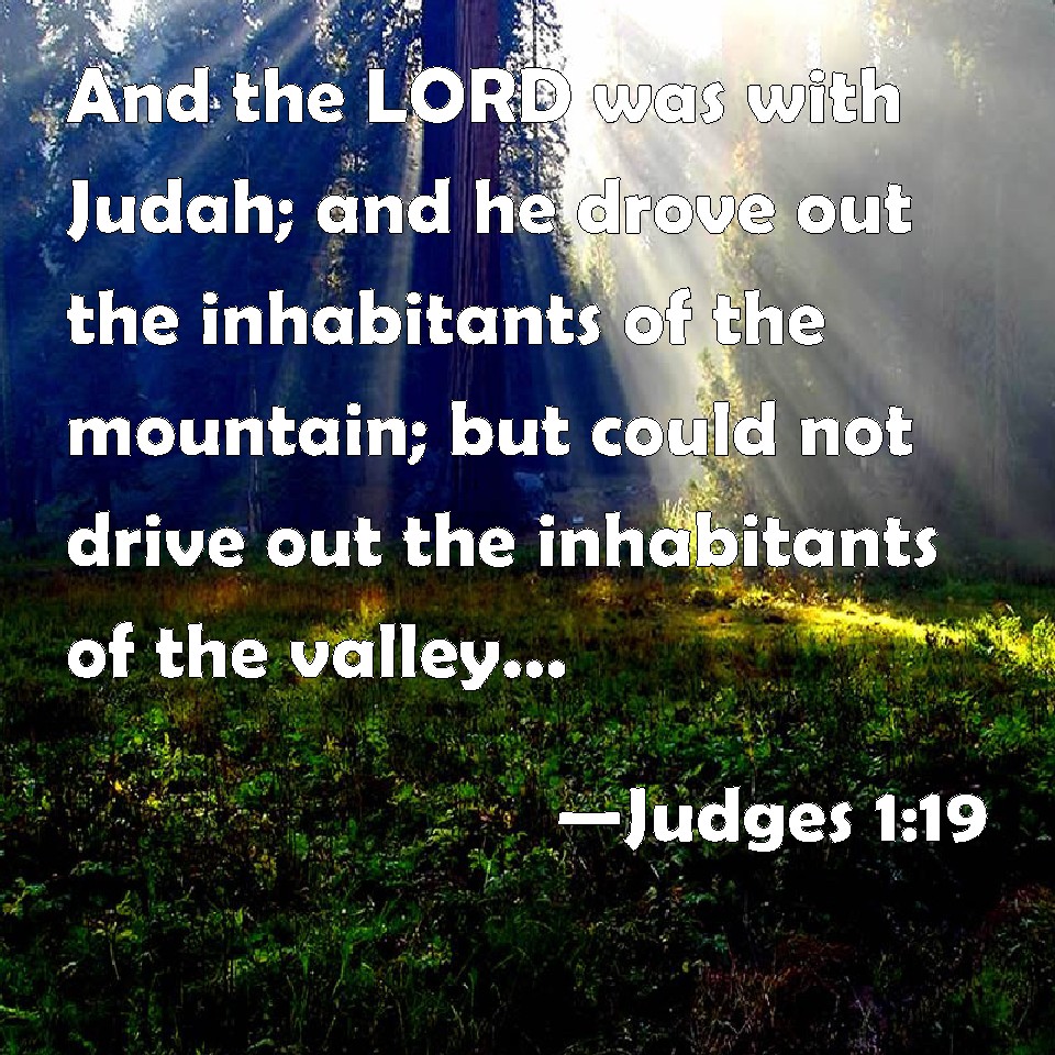 Choose a Background Judges 1:19 And the LORD was with Judah; and he drove out the inhabitants of the mountain; but could not drive out the inhabitants of the valley, because they had chariots of iron. KJV: And the LORD was with Judah; and he drave out the inhabitants of the mountain; but could not drive out the inhabitants of the valley, because they had chariots of iron. DRB: And the Lord was with Juda, and he possessed the hill country: but was not able to destroy the inhabitants of the valley, because they had many chariots armed with scythes. DBT: And the LORD was with Judah, and he took possession of the hill country, but he could not drive out the inhabitants of the plain, because they had chariots of iron. ERV: And the LORD was with Judah; and he drave out the inhabitants of the hill country; for he could not drive out the inhabitants of the valley, because they had chariots of iron. WBT: And the LORD was with Judah; and he drove out the inhabitants of the mountain; but could not drive out the inhabitants of the valley, because they had chariots of iron. WEB: Yahweh was with Judah; and drove out [the inhabitants of] the hill country; for he could not drive out the inhabitants of the valley, because they had chariots of iron. YLT: and Jehovah is with Judah, and he occupieth the hill-country, but not to dispossess the inhabitants of the valley, for they have chariots of iron.Links Judges 1:19 NIV • Judges 1:19 NLT • Judges 1:19 ESV • Judges 1:19 NASB • Judges 1:19 KJV • Judges 1:19 Interlinear • Judges 1:19 Commentaries • Judges 1:19 Parallel Texts • Judges 1:19 Bible Apps • Judges 1:19 Parallel • Bible Hub |