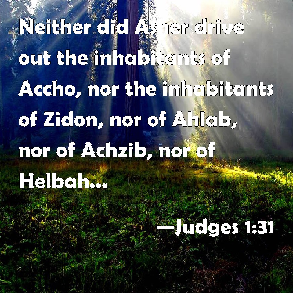 Choose a Background Judges 1:31 Neither did Asher drive out the inhabitants of Accho, nor the inhabitants of Zidon, nor of Ahlab, nor of Achzib, nor of Helbah, nor of Aphik, nor of Rehob: KJV: Neither did Asher drive out the inhabitants of Accho, nor the inhabitants of Zidon, nor of Ahlab, nor of Achzib, nor of Helbah, nor of Aphik, nor of Rehob: DRB: Aser also destroyed not the inhabitants of Accho, and of Sidon, of Ahalab, and of Achazib, and of Helba, and of Aphec, and of Rohob: DBT: Asher did not drive out the inhabitants of Acco, or the inhabitants of Sidon, or of Ahlab, or of Achzib, or of Helbah, or of Aphik, or of Rehob; ERV: Asher drave not out the inhabitants of Acco, nor the inhabitants of Zidon, nor of Ahlab, nor of Achzib, nor of Helbah, nor of Aphik, nor of Rehob: WBT: Neither did Asher expel the inhabitants of Accho, nor the inhabitants of Zidon, nor of Ahlab, nor of Achzib, nor of Helbah, nor of Aphik, nor of Rehob: WEB: Asher didn't drive out the inhabitants of Acco, nor the inhabitants of Sidon, nor of Ahlab, nor of Achzib, nor of Helbah, nor of Aphik, nor of Rehob; YLT: Asher hath not dispossessed the inhabitants of Accho, and the inhabitants of Zidon, and Ahlab, and Achzib, and Helbah, and Aphik, and Rehob;Links Judges 1:31 NIV • Judges 1:31 NLT • Judges 1:31 ESV • Judges 1:31 NASB • Judges 1:31 KJV • Judges 1:31 Interlinear • Judges 1:31 Commentaries • Judges 1:31 Parallel Texts • Judges 1:31 Bible Apps • Judges 1:31 Parallel • Bible Hub |