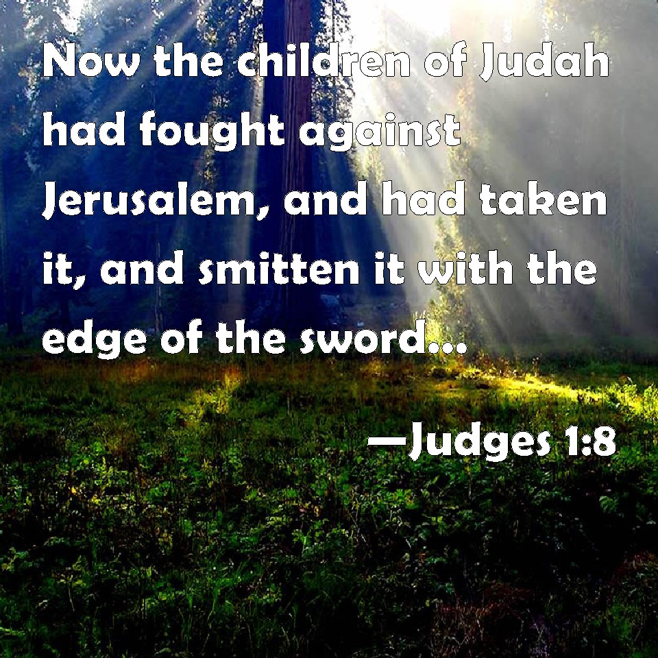 Choose a Background Judges 1:8 Now the children of Judah had fought against Jerusalem, and had taken it, and smitten it with the edge of the sword, and set the city on fire. KJV: Now the children of Judah had fought against Jerusalem, and had taken it, and smitten it with the edge of the sword, and set the city on fire. DRB: And the children of Juda besieging Jerusalem, took it, and put it to the sword, and set the whole city on fire. DBT: And the men of Judah fought against Jerusalem, and took it, and smote it with the edge of the sword, and set the city on fire. ERV: And the children of Judah fought against Jerusalem, and took it, and smote it with the edge of the sword, and set the city on fire. WBT: (Now the children of Judah had fought against Jerusalem, and had taken it, and smitten it with the edge of the sword, and set the city on fire.) WEB: The children of Judah fought against Jerusalem, and took it, and struck it with the edge of the sword, and set the city on fire. YLT: And the sons of Judah fight against Jerusalem, and capture it, and smite it by the mouth of the sword, and the city they have sent into fire;Links Judges 1:8 NIV • Judges 1:8 NLT • Judges 1:8 ESV • Judges 1:8 NASB • Judges 1:8 KJV • Judges 1:8 Interlinear • Judges 1:8 Commentaries • Judges 1:8 Parallel Texts • Judges 1:8 Bible Apps • Judges 1:8 Parallel • Bible Hub |
