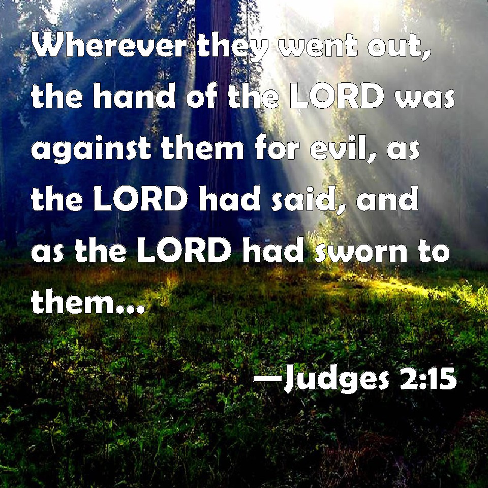 Choose a Background Judges 2:15 Wherever they went out, the hand of the LORD was against them for evil, as the LORD had said, and as the LORD had sworn to them: and they were greatly distressed. KJV: Whithersoever they went out, the hand of the LORD was against them for evil, as the LORD had said, and as the LORD had sworn unto them: and they were greatly distressed. DRB: But whithersoever they meant to go, the hand of the Lord was upon them, as he had said, and as he had sworn to them: and they were greatly distressed. DBT: Whenever they marched out, the hand of the LORD was against them for evil, as the LORD had warned, and as the LORD had sworn to them; and they were in sore straits. ERV: Whithersoever they went out, the hand of the LORD was against them for evil, as the LORD had spoken, and as the LORD had sworn unto them: and they were sore distressed. WBT: Whithersoever they went out, the hand of the LORD was against them for evil, as the LORD had said, and as the LORD had sworn to them: and they were greatly distressed. WEB: Wherever they went out, the hand of Yahweh was against them for evil, as Yahweh had spoken, and as Yahweh had sworn to them: and they were very distressed. YLT: in every place where they have gone out, the hand of Jehovah hath been against them for evil, as Jehovah hath spoken, and as Jehovah hath sworn to them, and they are distressed — greatly.Links Judges 2:15 NIV • Judges 2:15 NLT • Judges 2:15 ESV • Judges 2:15 NASB • Judges 2:15 KJV • Judges 2:15 Interlinear • Judges 2:15 Commentaries • Judges 2:15 Parallel Texts • Judges 2:15 Bible Apps • Judges 2:15 Parallel • Bible Hub |