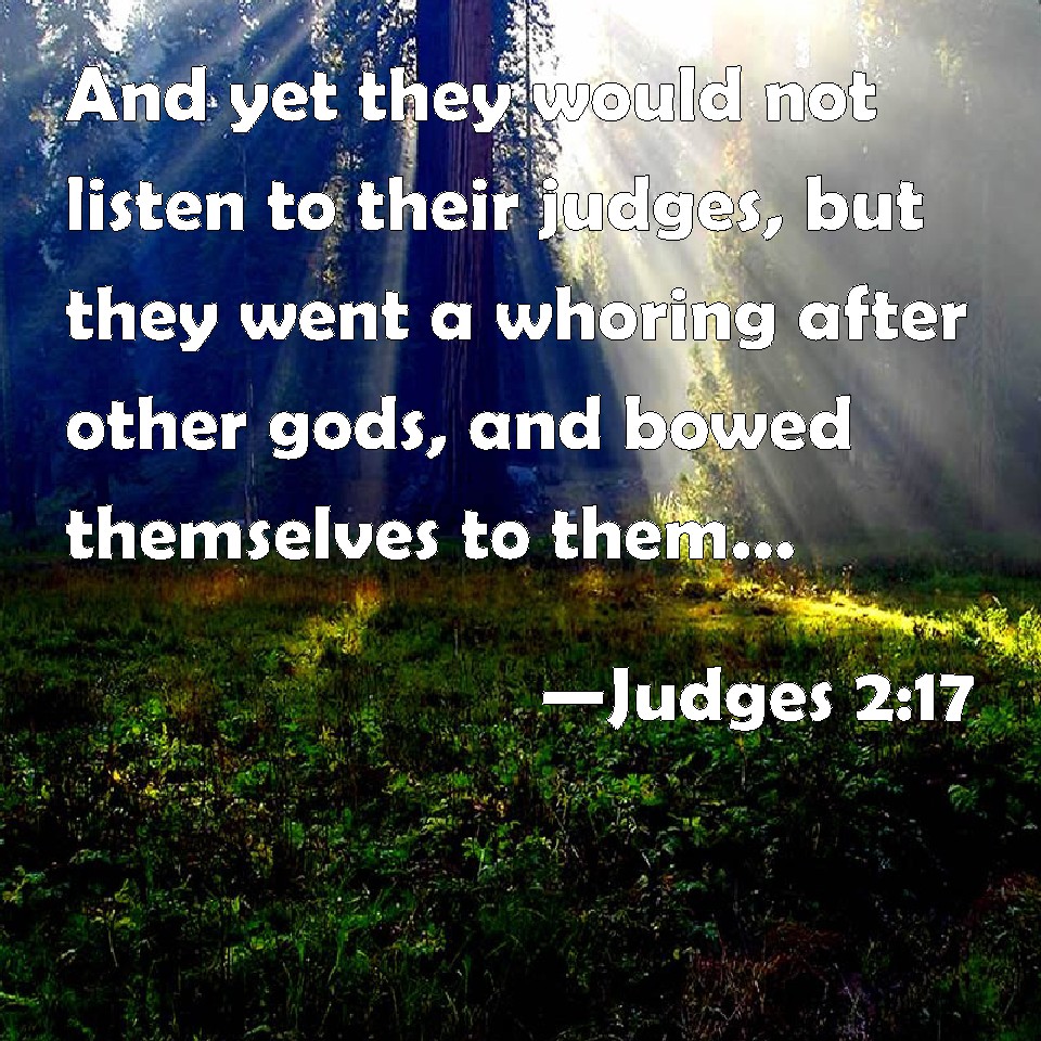 Choose a Background Judges 2:17 And yet they would not listen to their judges, but they went a whoring after other gods, and bowed themselves to them: they turned quickly out of the way which their fathers walked in, obeying the commandments of the LORD; but they did not so. KJV: And yet they would not hearken unto their judges, but they went a whoring after other gods, and bowed themselves unto them: they turned quickly out of the way which their fathers walked in, obeying the commandments of the LORD; but they did not so. DRB: Committing fornication with strange gods, and adoring them. They quickly forsook the way, in which their fathers had walked: and hearing the commandments of the Lord, they did all things contrary. DBT: And yet they did not listen to their judges; for they played the harlot after other gods and bowed down to them; they soon turned aside from the way in which their fathers had walked, who had obeyed the commandments of the LORD, and they did not do so. ERV: And yet they hearkened not unto their judges, for they went a whoring after other gods, and bowed themselves down unto them: they turned aside quickly out of the way wherein their fathers walked, obeying the commandments of the LORD; but they did not so. WBT: And yet they would not hearken to their judges, but they went astray after other gods, and bowed themselves to them: they turned quickly out of the way which their fathers walked in, obeying the commandments of the LORD; but they did not so. WEB: Yet they didn't listen to their judges; for they played the prostitute after other gods, and bowed themselves down to them: they turned aside quickly out of the way in which their fathers walked, obeying the commandments of Yahweh; [but] they didn't do so. YLT: and also unto their judges they have not hearkened, but have gone a-whoring after other gods, and bow themselves to them; they have turned aside with haste out of the way in which their fathers walked to obey the commands of Jehovah — they have not done so.Links Judges 2:17 NIV • Judges 2:17 NLT • Judges 2:17 ESV • Judges 2:17 NASB • Judges 2:17 KJV • Judges 2:17 Interlinear • Judges 2:17 Commentaries • Judges 2:17 Parallel Texts • Judges 2:17 Bible Apps • Judges 2:17 Parallel • Bible Hub |