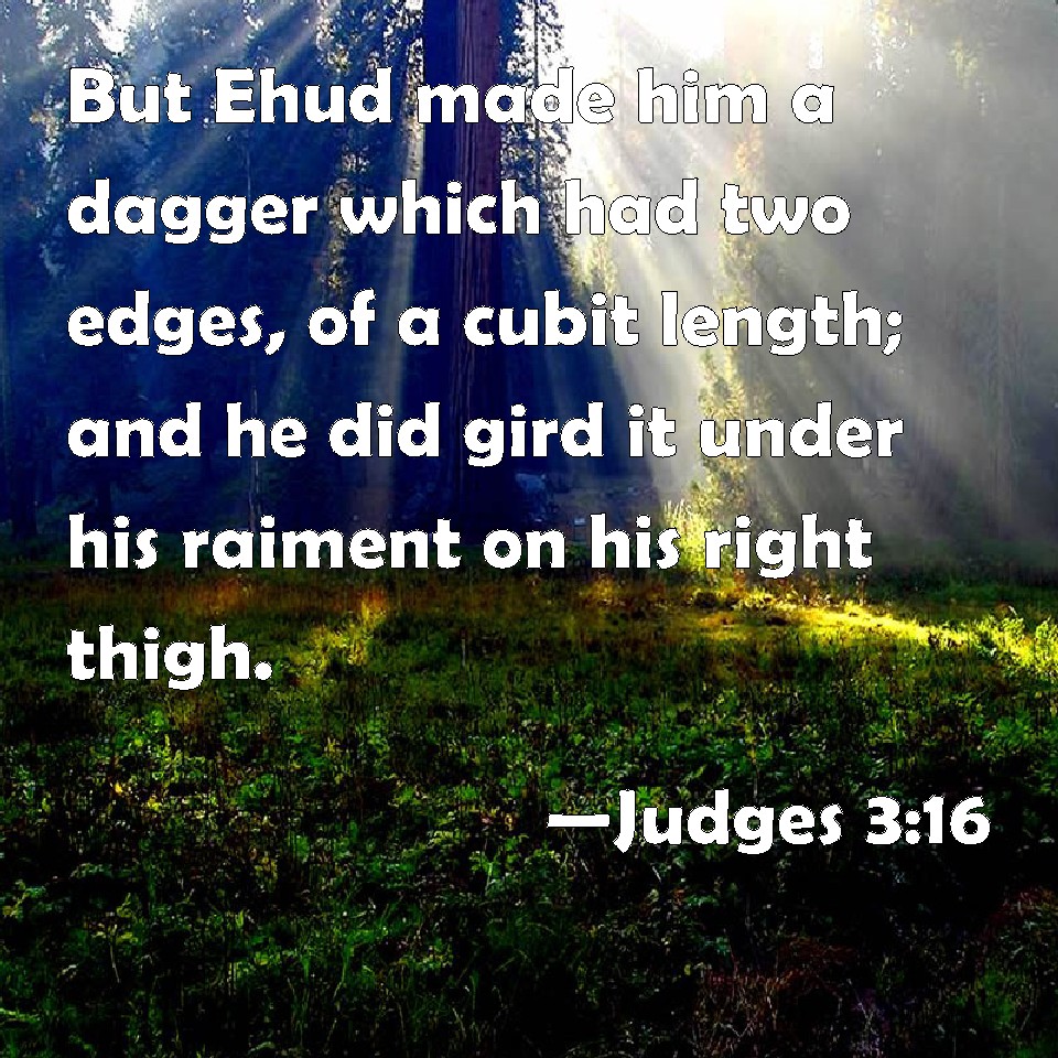 Choose a Background Judges 3:16 But Ehud made him a dagger which had two edges, of a cubit length; and he did gird it under his raiment on his right thigh. KJV: But Ehud made him a dagger which had two edges, of a cubit length; and he did gird it under his raiment upon his right thigh. DRB: And he made himself a two-edged sword, with a haft in the midst of the length of the palm of the hand, and was girded therewith under his garment on the right thigh. DBT: And Ehud made for himself a sword with two edges, a cubit in length; and he girded it on his right thigh under his clothes. ERV: And Ehud made him a sword which had two edges, of a cubit length; and he girded it under his raiment upon his right thigh. WBT: But Ehud made him a dagger which had two edges, of a cubit length; and he girded it under his raiment upon his right thigh. WEB: Ehud made him a sword which had two edges, a cubit in length; and he wore it under his clothing on his right thigh. YLT: and Ehud maketh for himself a sword, and it hath two mouths (a cubit is its length), and he girdeth it under his long robe on his right thigh;Links Judges 3:16 NIV • Judges 3:16 NLT • Judges 3:16 ESV • Judges 3:16 NASB • Judges 3:16 KJV • Judges 3:16 Interlinear • Judges 3:16 Commentaries • Judges 3:16 Parallel Texts • Judges 3:16 Bible Apps • Judges 3:16 Parallel • Bible Hub |
