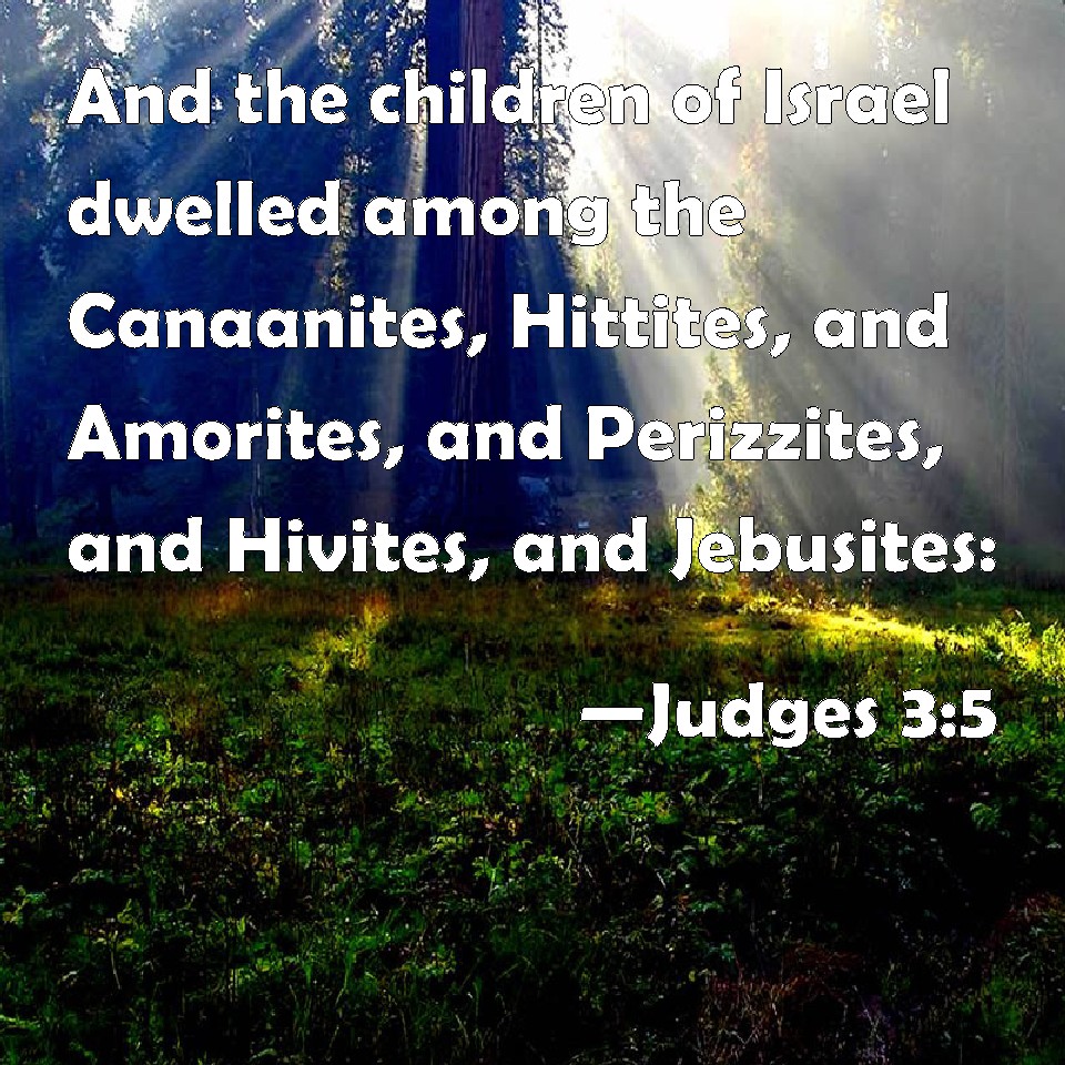 Choose a Background Judges 3:5 And the children of Israel dwelled among the Canaanites, Hittites, and Amorites, and Perizzites, and Hivites, and Jebusites: KJV: And the children of Israel dwelt among the Canaanites, Hittites, and Amorites, and Perizzites, and Hivites, and Jebusites: DRB: So the children of Israel dwelt in the midst of the Chanaanite, and the Hethite, and the Amorrhite, and the Pherezite, and the Hevite, and the Jebusite: DBT: So the people of Israel dwelt among the Canaanites, the Hittites, the Amorites, the Per'izzites, the Hivites, and the Jeb'usites; ERV: And the children of Israel dwelt among the Canaanites; the Hittite, and the Amorite, and the Perizzite, and the Hivite, and the Jebusite: WBT: And the children of Israel dwelt among the Canaanites, Hittites, and Amorites, and Perizzites, and Hivites, and Jebusites: WEB: The children of Israel lived among the Canaanites, the Hittites, and the Amorites, and the Perizzites, and the Hivites, and the Jebusites: YLT: And the sons of Israel have dwelt in the midst of the Canaanite, the Hittite, and the Amorite, and the Perizzite, and the Hivite, and the Jebusite,Links Judges 3:5 NIV • Judges 3:5 NLT • Judges 3:5 ESV • Judges 3:5 NASB • Judges 3:5 KJV • Judges 3:5 Interlinear • Judges 3:5 Commentaries • Judges 3:5 Parallel Texts • Judges 3:5 Bible Apps • Judges 3:5 Parallel • Bible Hub |