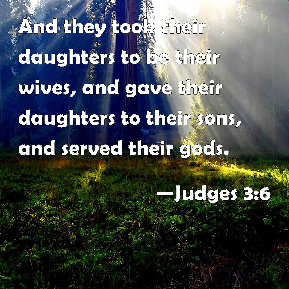 Choose a Background Judges 3:6 And they took their daughters to be their wives, and gave their daughters to their sons, and served their gods. KJV: And they took their daughters to be their wives, and gave their daughters to their sons, and served their gods. DRB: And they took their daughters to wives, and they gave their own daughters to their sons, and they served their gods. DBT: and they took their daughters to themselves for wives, and their own daughters they gave to their sons; and they served their gods. ERV: and they took their daughters to be their wives, and gave their own daughters to their sons, and served their gods. WBT: And they took their daughters to be their wives, and gave their daughters to their sons, and served their gods. WEB: and they took their daughters to be their wives, and gave their own daughters to their sons and served their gods. YLT: and take their daughters to them for wives, and their daughters have given to their sons, and they serve their gods;Links Judges 3:6 NIV • Judges 3:6 NLT • Judges 3:6 ESV • Judges 3:6 NASB • Judges 3:6 KJV • Judges 3:6 Interlinear • Judges 3:6 Commentaries • Judges 3:6 Parallel Texts • Judges 3:6 Bible Apps • Judges 3:6 Parallel • Bible Hub |