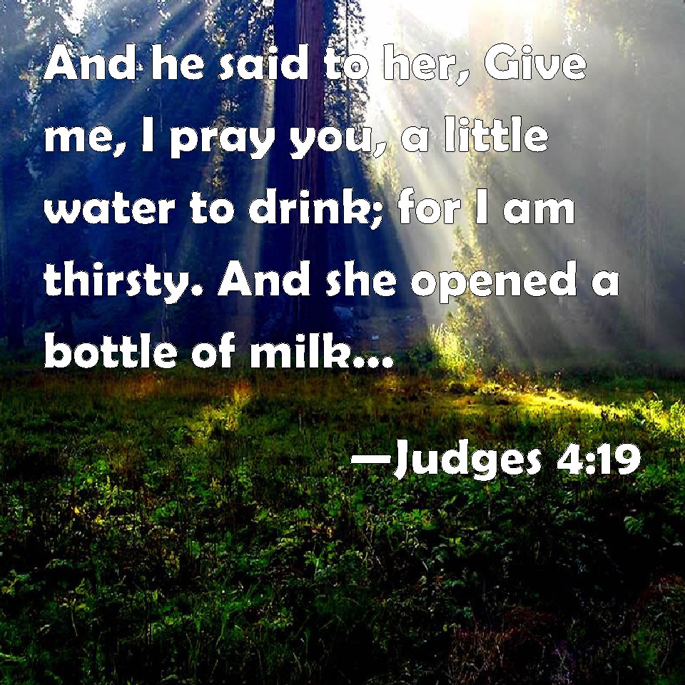 Choose a Background Judges 4:19 And he said to her, Give me, I pray you, a little water to drink; for I am thirsty. And she opened a bottle of milk, and gave him drink, and covered him. KJV: And he said unto her, Give me, I pray thee, a little water to drink; for I am thirsty. And she opened a bottle of milk, and gave him drink, and covered him. DRB: Said to her: Give me, I beseech thee, a little water, for I am very thirsty. She opened a bottle of milk, and gave him to drink, and covered him. DBT: And he said to her, "Pray, give me a little water to drink; for I am thirsty." So she opened a skin of milk and gave him a drink and covered him. ERV: And he said unto her, Give me, I pray thee, a little water to drink; for I am thirsty. And she opened a bottle of milk, and gave him drink, and covered him. WBT: And he said to her, Give me, I pray thee, a little water to drink; for I am thirsty. And she opened a bottle of milk, and gave him drink, and covered him. WEB: He said to her, "Please give me a little water to drink; for I am thirsty." She opened a bottle of milk, and gave him drink, and covered him. YLT: And he saith unto her, 'Give me to drink, I pray thee, a little water, for I am thirsty;' and she openeth the bottle of milk, and giveth him to drink, and covereth him.Links Judges 4:19 NIV • Judges 4:19 NLT • Judges 4:19 ESV • Judges 4:19 NASB • Judges 4:19 KJV • Judges 4:19 Interlinear • Judges 4:19 Commentaries • Judges 4:19 Parallel Texts • Judges 4:19 Bible Apps • Judges 4:19 Parallel • Bible Hub |