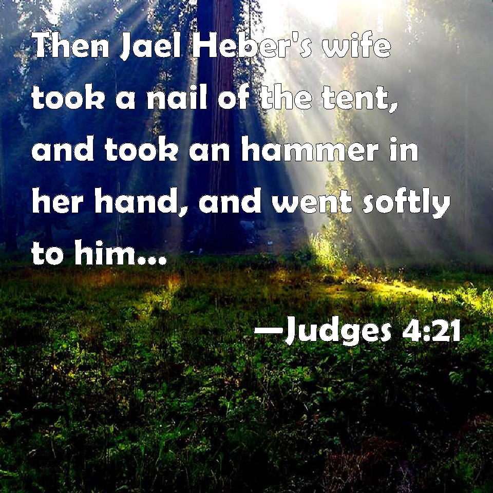 Choose a Background Judges 4:21 Then Jael Heber's wife took a nail of the tent, and took an hammer in her hand, and went softly to him, and smote the nail into his temples, and fastened it into the ground: for he was fast asleep and weary. So he died. KJV: Then Jael Heber's wife took a nail of the tent, and took an hammer in her hand, and went softly unto him, and smote the nail into his temples, and fastened it into the ground: for he was fast asleep and weary. So he died. DRB: So Jahel Haber's wife took a nail of the tent, and taking also a hammer: and going in softly, and with silence, she put the nail upon the temples of his head, and striking it With the hammer, drove it through his brain fast into the ground: and so passing from deep sleep to death, he fainted away and died. DBT: But Ja'el the wife of Heber took a tent peg, and took a hammer in her hand, and went softly to him and drove the peg into his temple, till it went down into the ground, as he was lying fast asleep from weariness. So he died. ERV: Then Jael Heber's wife took a tent-pin, and took an hammer in her hand, and went softly unto him, and smote the pin into his temples, and it pierced through into the ground; for he was in a deep sleep; so he swooned and died. WBT: Then Jael, Heber's wife, took a nail of the tent, and took a hammer in her hand, and went softly to him, and smote the nail into his temples, and fastened it into the ground: for he was fast asleep, and weary. So he died. WEB: Then Jael Heber's wife took a tent peg, and took a hammer in her hand, and went softly to him, and struck the pin into his temples, and it pierced through into the ground; for he was in a deep sleep; so he swooned and died. YLT: And Jael wife of Heber taketh the pin of the tent, and taketh the hammer in her hand, and goeth unto him gently, and striketh the pin into his temples, and it fasteneth in the earth — and he hath been fast asleep, and is weary — and he dieth.Links Judges 4:21 NIV • Judges 4:21 NLT • Judges 4:21 ESV • Judges 4:21 NASB • Judges 4:21 KJV • Judges 4:21 Interlinear • Judges 4:21 Commentaries • Judges 4:21 Parallel Texts • Judges 4:21 Bible Apps • Judges 4:21 Parallel • Bible Hub |