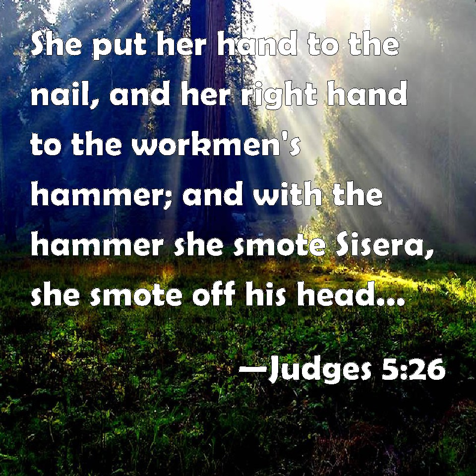 Choose a Background Judges 5:26 She put her hand to the nail, and her right hand to the workmen's hammer; and with the hammer she smote Sisera, she smote off his head, when she had pierced and stricken through his temples. KJV: She put her hand to the nail, and her right hand to the workmen's hammer; and with the hammer she smote Sisera, she smote off his head, when she had pierced and stricken through his temples. DRB: She put her left hand to the nail, and her right hand to the workman's hammer, and she struck Sisara, seeking in his head a place for the wound, and strongly piercing through his temples. DBT: She put her hand to the tent peg and her right hand to the workmen's mallet; she struck Sis'era a blow, she crushed his head, she shattered and pierced his temple. ERV: She put her hand to the nail, and her right hand to the workmen's hammer; and with the hammer she smote Sisera, she smote through his head, yea, she pierced and struck through his temples. WBT: She put her hand to the nail, and her right hand to the workmen's hammer; and with the hammer she smote Sisera, she smote off his head, when she had pierced and struck through his temples. WEB: She put her hand to the tent peg, and her right hand to the workmen's hammer. With the hammer she struck Sisera. She struck through his head. Yes, she pierced and struck through his temples. YLT: Her hand to the pin she sendeth forth, And her right hand to the labourers' hammer, And she hammered Sisera — she smote his head, Yea, she smote, and it passed through his temple.Links Judges 5:26 NIV • Judges 5:26 NLT • Judges 5:26 ESV • Judges 5:26 NASB • Judges 5:26 KJV • Judges 5:26 Interlinear • Judges 5:26 Commentaries • Judges 5:26 Parallel Texts • Judges 5:26 Bible Apps • Judges 5:26 Parallel • Bible Hub |