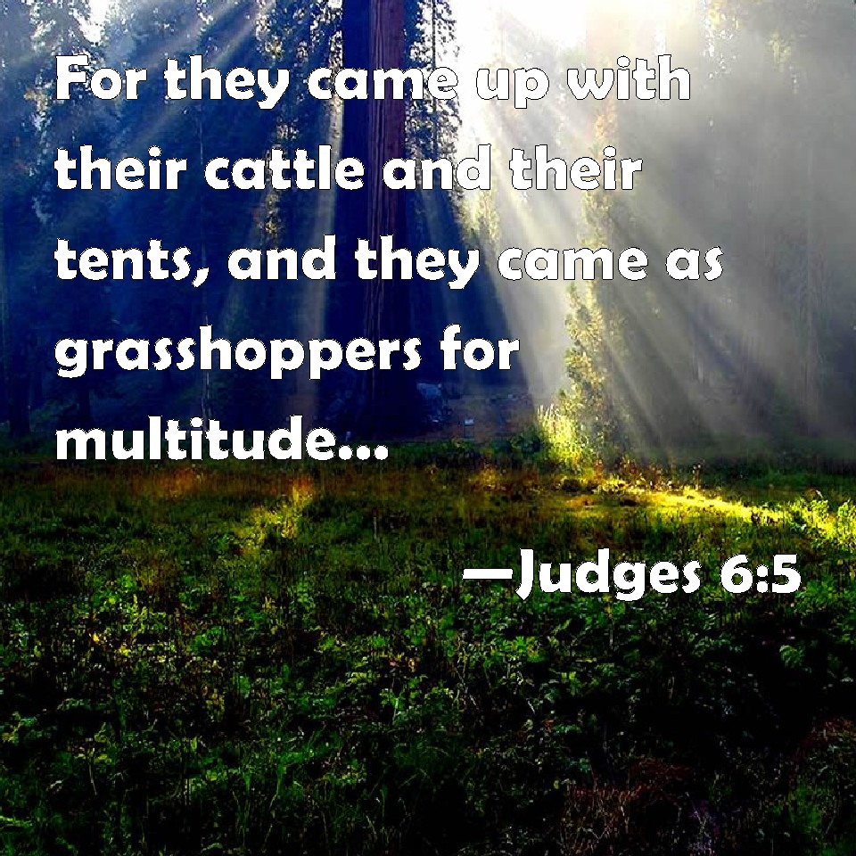 Choose a Background Judges 6:5 For they came up with their cattle and their tents, and they came as grasshoppers for multitude; for both they and their camels were without number: and they entered into the land to destroy it. KJV: For they came up with their cattle and their tents, and they came as grasshoppers for multitude; for both they and their camels were without number: and they entered into the land to destroy it. DRB: For they and all their flocks came with their tents, and like locusts filled all places, an innumerable multitude of men, and of camels, wasting whatsoever they touched. DBT: For they would come up with their cattle and their tents, coming like locusts for number; both they and their camels could not be counted; so that they wasted the land as they came in. ERV: For they came up with their cattle and their tents, they came in as locusts for multitude; both they and their camels were without number: and they came into the land to destroy it. WBT: For they came up with their cattle, and their tents, and they came as grasshoppers for multitude; for both they and their camels were without number: and they entered into the land to destroy it. WEB: For they came up with their livestock and their tents; they came in as locusts for multitude; both they and their camels were without number: and they came into the land to destroy it. YLT: for they and their cattle come up, with their tents; they come in as the fulness of the locust for multitude, and of them and of their cattle there is no number, and they come into the land to destroy it.Links Judges 6:5 NIV • Judges 6:5 NLT • Judges 6:5 ESV • Judges 6:5 NASB • Judges 6:5 KJV • Judges 6:5 Interlinear • Judges 6:5 Commentaries • Judges 6:5 Parallel Texts • Judges 6:5 Bible Apps • Judges 6:5 Parallel • Bible Hub |