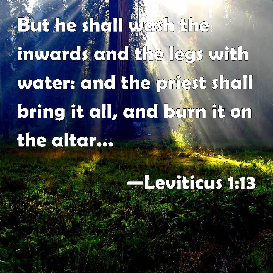 Choose a Background Leviticus 1:13 But he shall wash the inwards and the legs with water: and the priest shall bring it all, and burn it on the altar: it is a burnt sacrifice, an offering made by fire, of a sweet smell to the LORD. KJV: But he shall wash the inwards and the legs with water: and the priest shall bring it all, and burn it upon the altar: it is a burnt sacrifice, an offering made by fire, of a sweet savour unto the LORD. DRB: But the entrails and the feet they shall wash with water. And the priest shall offer it all and burn it all upon the altar for a holocaust, and most sweet savour to the Lord. DBT: but the inwards and the legs shall he wash with water; and the priest shall present it all, and burn it on the altar: it is a burnt-offering, an offering by fire to Jehovah of a sweet odour. ERV: but the inwards and the legs shall he wash with water: and the priest shall offer the whole, and burn it upon the altar: it is a burnt offering, an offering made by fire, of a sweet savour unto the LORD. WBT: But he shall wash the inwards and the legs with water: and the priest shall bring it all, and burn it upon the altar: it is a burnt sacrifice, an offering made by fire, of a sweet savor to the LORD. WEB: but the innards and the legs he shall wash with water. The priest shall offer the whole, and burn it on the altar. It is a burnt offering, an offering made by fire, of a pleasant aroma to Yahweh. YLT: and the inwards and the legs he doth wash with water, and the priest hath brought the whole near, and hath made perfume on the altar; it is a burnt-offering, a fire-offering of sweet fragrance to Jehovah.Links Leviticus 1:13 NIV • Leviticus 1:13 NLT • Leviticus 1:13 ESV • Leviticus 1:13 NASB • Leviticus 1:13 KJV • Leviticus 1:13 Interlinear • Leviticus 1:13 Commentaries • Leviticus 1:13 Parallel Texts • Leviticus 1:13 Bible Apps • Leviticus 1:13 Parallel • Bible Hub |