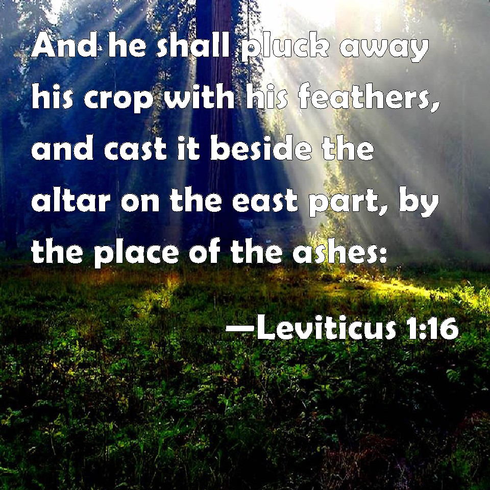 Choose a Background Leviticus 1:16 And he shall pluck away his crop with his feathers, and cast it beside the altar on the east part, by the place of the ashes: KJV: And he shall pluck away his crop with his feathers, and cast it beside the altar on the east part, by the place of the ashes: DRB: But the crop of the throat, and the feathers he shall cast beside the altar at the east side, in the place where the ashes are wont to be poured out, DBT: And he shall remove its crop with its feathers, and cast it beside the altar on the east, into the place of the ashes; ERV: and he shall take away its crop with the filth thereof, and cast it beside the altar on the east part, in the place of the ashes: WBT: And he shall pluck away its crop with its feathers, and cast it beside the altar on the east part, by the place of the ashes: WEB: and he shall take away its crop with its filth, and cast it beside the altar on the east part, in the place of the ashes. YLT: and he hath turned aside its crop with its feathers, and hath cast it near the altar, eastward, unto the place of ashes;Links Leviticus 1:16 NIV • Leviticus 1:16 NLT • Leviticus 1:16 ESV • Leviticus 1:16 NASB • Leviticus 1:16 KJV • Leviticus 1:16 Interlinear • Leviticus 1:16 Commentaries • Leviticus 1:16 Parallel Texts • Leviticus 1:16 Bible Apps • Leviticus 1:16 Parallel • Bible Hub |