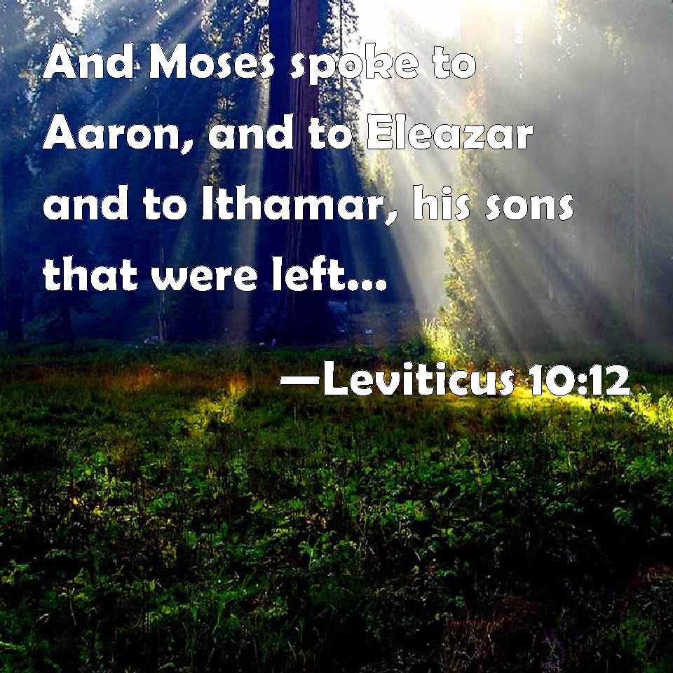 Choose a Background Leviticus 10:12 And Moses spoke to Aaron, and to Eleazar and to Ithamar, his sons that were left, Take the meat offering that remains of the offerings of the LORD made by fire, and eat it without leaven beside the altar: for it is most holy: KJV: And Moses spake unto Aaron, and unto Eleazar and unto Ithamar, his sons that were left, Take the meat offering that remaineth of the offerings of the LORD made by fire, and eat it without leaven beside the altar: for it is most holy: DRB: And Moses spoke to Aaron, and to Eleazar and Ithamar, his sons that were left: Take the sacrifice that is remaining of the oblation of the Lord, and eat it without leaven beside the altar, because it is holy of holies. DBT: And Moses spoke to Aaron, and to Eleazar and to Ithamar, his sons that were left, Take the oblation that is left of Jehovah's offerings by fire, and eat it with unleavened bread beside the altar; for it is most holy. ERV: And Moses spake unto Aaron, and unto Eleazar and unto Ithamar, his sons that were left, Take the meal offering that remaineth of the offerings of the LORD made by fire, and eat it without leaven beside the altar: for it is most holy: WBT: And Moses spoke to Aaron, and to Eleazar and to Ithamar, his sons that were left, Take the meat-offering that remaineth of the offerings of the LORD made by fire, and eat it without leaven beside the altar: for it is most holy: WEB: Moses spoke to Aaron, and to Eleazar and to Ithamar, his sons who were left, "Take the meal offering that remains of the offerings of Yahweh made by fire, and eat it without yeast beside the altar; for it is most holy; YLT: And Moses speaketh unto Aaron, and unto Eleazar, and unto Ithamar his sons, who are left, 'Take ye the present that is left from the fire-offerings of Jehovah, and eat it unleavened near the altar, for it is most holy,Links Leviticus 10:12 NIV • Leviticus 10:12 NLT • Leviticus 10:12 ESV • Leviticus 10:12 NASB • Leviticus 10:12 KJV • Leviticus 10:12 Interlinear • Leviticus 10:12 Commentaries • Leviticus 10:12 Parallel Texts • Leviticus 10:12 Bible Apps • Leviticus 10:12 Parallel • Bible Hub |