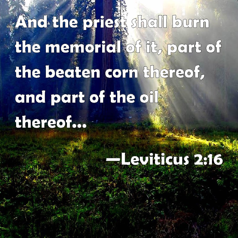 Choose a Background Leviticus 2:16 And the priest shall burn the memorial of it, part of the beaten corn thereof, and part of the oil thereof, with all the frankincense thereof: it is an offering made by fire to the LORD. KJV: And the priest shall burn the memorial of it, part of the beaten corn thereof, and part of the oil thereof, with all the frankincense thereof: it is an offering made by fire unto the LORD. DRB: Whereof the priest shall burn for a memorial of the gift, part of the corn broken small and of the oil, and all the frankincense. DBT: And the priest shall burn the memorial thereof, part of the beaten corn thereof, and part of the oil thereof, with all the frankincense thereof: it is an offering by fire to Jehovah. ERV: And the priest shall burn the memorial of it, part of the bruised corn thereof, and part of the oil thereof, with all the frankincense thereof: it is an offering made by fire unto the LORD. WBT: And the priest shall burn the memorial of it, part of its beaten corn, and part of its oil, with all its frankincense: it is an offering made by fire to the LORD. WEB: The priest shall burn as its memorial, part of its bruised grain, and part of its oil, along with all its frankincense: it is an offering made by fire to Yahweh. YLT: and the priest hath made perfume with its memorial from its beaten out corn, and from its oil, besides all its frankincense — a fire-offering to Jehovah.Links Leviticus 2:16 NIV • Leviticus 2:16 NLT • Leviticus 2:16 ESV • Leviticus 2:16 NASB • Leviticus 2:16 KJV • Leviticus 2:16 Interlinear • Leviticus 2:16 Commentaries • Leviticus 2:16 Parallel Texts • Leviticus 2:16 Bible Apps • Leviticus 2:16 Parallel • Bible Hub |