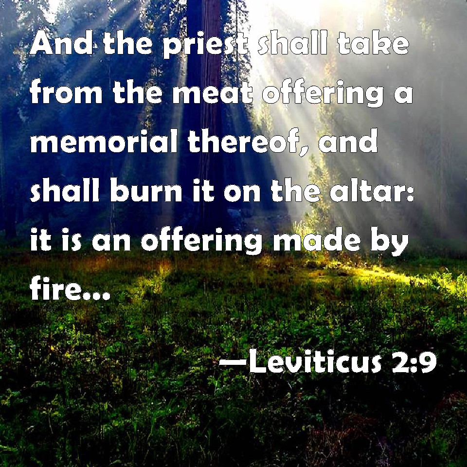 Choose a Background Leviticus 2:9 And the priest shall take from the meat offering a memorial thereof, and shall burn it on the altar: it is an offering made by fire, of a sweet smell to the LORD. KJV: And the priest shall take from the meat offering a memorial thereof, and shall burn it upon the altar: it is an offering made by fire, of a sweet savour unto the LORD. DRB: And when he hath offered it, he shall take a memorial out of the sacrifice, and burn it upon the altar for a sweet savour to the Lord. DBT: And the priest shall take from the oblation a memorial thereof, and shall burn it on the altar, an offering by fire to Jehovah of a sweet odour. ERV: And the priest shall take up from the meal offering the memorial thereof, and shall burn it upon the altar: an offering made by fire, of a sweet savour unto the LORD. WBT: And the priest shall take from the meat-offering a memorial of it, and shall burn it upon the altar: it is an offering made by fire, of a sweet savor to the LORD. WEB: The priest shall take from the meal offering its memorial, and shall burn it on the altar, an offering made by fire, of a pleasant aroma to Yahweh. YLT: and the priest hath lifted up from the present its memorial, and hath made perfume on the altar, a fire-offering of sweet fragrance to Jehovah;Links Leviticus 2:9 NIV • Leviticus 2:9 NLT • Leviticus 2:9 ESV • Leviticus 2:9 NASB • Leviticus 2:9 KJV • Leviticus 2:9 Interlinear • Leviticus 2:9 Commentaries • Leviticus 2:9 Parallel Texts • Leviticus 2:9 Bible Apps • Leviticus 2:9 Parallel • Bible Hub |