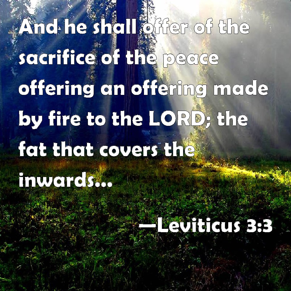 Choose a Background Leviticus 3:3 And he shall offer of the sacrifice of the peace offering an offering made by fire to the LORD; the fat that covers the inwards, and all the fat that is on the inwards, KJV: And he shall offer of the sacrifice of the peace offering an offering made by fire unto the LORD; the fat that covereth the inwards, and all the fat that is upon the inwards, DRB: And they shall offer of the sacrifice of peace offerings, for an oblation to the Lord, the fat that covereth the entrails, and all the fat that is within. DBT: And he shall present of the sacrifice of peace-offering an offering by fire to Jehovah; the fat that covereth the inwards, and all the fat that is on the inwards, ERV: And he shall offer of the sacrifice of peace offerings an offering made by fire unto the LORD; the fat that covereth the inwards, and all the fat that is upon the inwards, WBT: And he shall offer of the sacrifice of the peace-offering, an offering made by fire to the LORD; the fat that covereth the inwards, and all the fat that is upon the inwards, WEB: He shall offer of the sacrifice of peace offerings an offering made by fire to Yahweh; the fat that covers the innards, and all the fat that is on the innards, YLT: And he hath brought near from the sacrifice of the peace-offerings a fire-offering to Jehovah, the fat which is covering the inwards, and all the fat which is on the inwards,Links Leviticus 3:3 NIV • Leviticus 3:3 NLT • Leviticus 3:3 ESV • Leviticus 3:3 NASB • Leviticus 3:3 KJV • Leviticus 3:3 Interlinear • Leviticus 3:3 Commentaries • Leviticus 3:3 Parallel Texts • Leviticus 3:3 Bible Apps • Leviticus 3:3 Parallel • Bible Hub |