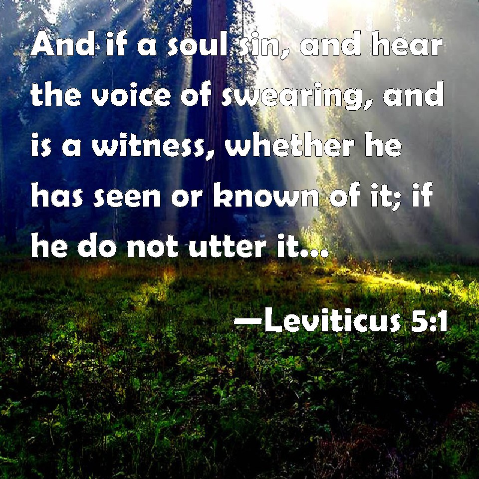 Choose a Background Leviticus 5:1 And if a soul sin, and hear the voice of swearing, and is a witness, whether he has seen or known of it; if he do not utter it, then he shall bear his iniquity. KJV: And if a soul sin, and hear the voice of swearing, and is a witness, whether he hath seen or known of it; if he do not utter it, then he shall bear his iniquity. DRB: If any one sin, and hear the voice of one swearing, and is a witness either because he himself hath seen, or is privy to it: if he do not utter it, he shall bear his iniquity. DBT: And if any one sin, and hear the voice of adjuration, and he is a witness whether he hath seen or known it, if he do not give information, then he shall bear his iniquity. ERV: And if any one sin, in that he heareth the voice of adjuration, he being a witness, whether he hath seen or known, if he do not utter it, then he shall bear his iniquity: WBT: And if a soul shall sin, and hear the voice of swearing, and be a witness, whether he hath seen or known of it; if he doth not utter it, then he shall bear his iniquity. WEB: "'If anyone sins, in that he hears the voice of adjuration, he being a witness, whether he has seen or known, if he doesn't report it, then he shall bear his iniquity. YLT: And when a person doth sin, and hath heard the voice of an oath, and he is witness, or hath seen, or hath known — if he declare not, then he hath borne his iniquity:Links Leviticus 5:1 NIV • Leviticus 5:1 NLT • Leviticus 5:1 ESV • Leviticus 5:1 NASB • Leviticus 5:1 KJV • Leviticus 5:1 Interlinear • Leviticus 5:1 Commentaries • Leviticus 5:1 Parallel Texts • Leviticus 5:1 Bible Apps • Leviticus 5:1 Parallel • Bible Hub |