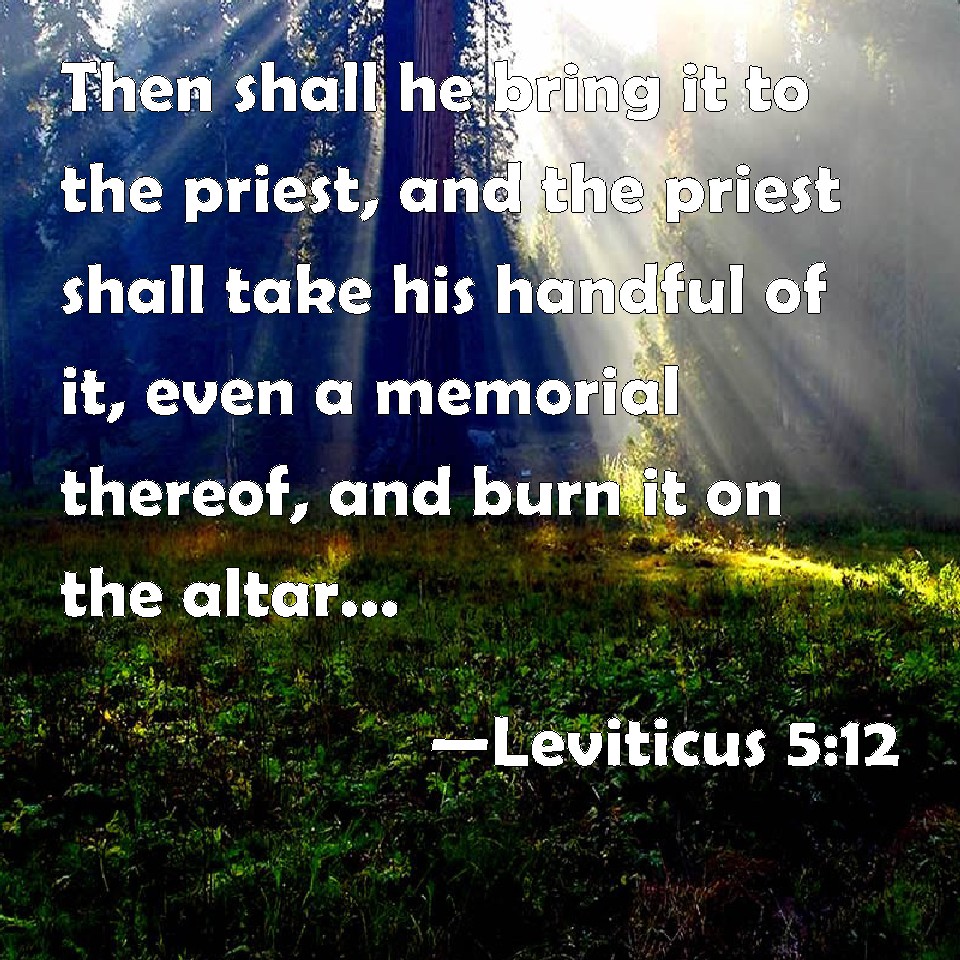 Choose a Background Leviticus 5:12 Then shall he bring it to the priest, and the priest shall take his handful of it, even a memorial thereof, and burn it on the altar, according to the offerings made by fire to the LORD: it is a sin offering. KJV: Then shall he bring it to the priest, and the priest shall take his handful of it, even a memorial thereof, and burn it on the altar, according to the offerings made by fire unto the LORD: it is a sin offering. DRB: And he shall deliver it to the priest: who shall take a handful thereof, and shall burn it upon the altar for a memorial of him that offered it: DBT: And he shall bring it to the priest, and the priest shall take his handful of it, the memorial thereof, and burn it on the altar, with Jehovah's offerings by fire: it is a sin-offering. ERV: And he shall bring it to the priest, and the priest shall take his handful of it as the memorial thereof, and burn it on the altar, upon the offerings of the LORD made by fire: it is a sin offering. WBT: Then shall he bring it to the priest, and the priest shall take his handful of it, even a memorial of it, and burn it on the altar, according to the offerings made by fire to the LORD: it is a sin-offering. WEB: He shall bring it to the priest, and the priest shall take his handful of it as the memorial portion, and burn it on the altar, on the offerings of Yahweh made by fire. It is a sin offering. YLT: and he hath brought it in unto the priest, and the priest hath taken a handful from it — the fulness of his hand — its memorial — and hath made perfume on the altar, according to the fire-offerings of Jehovah; it is a sin-offering.Links Leviticus 5:12 NIV • Leviticus 5:12 NLT • Leviticus 5:12 ESV • Leviticus 5:12 NASB • Leviticus 5:12 KJV • Leviticus 5:12 Interlinear • Leviticus 5:12 Commentaries • Leviticus 5:12 Parallel Texts • Leviticus 5:12 Bible Apps • Leviticus 5:12 Parallel • Bible Hub |
